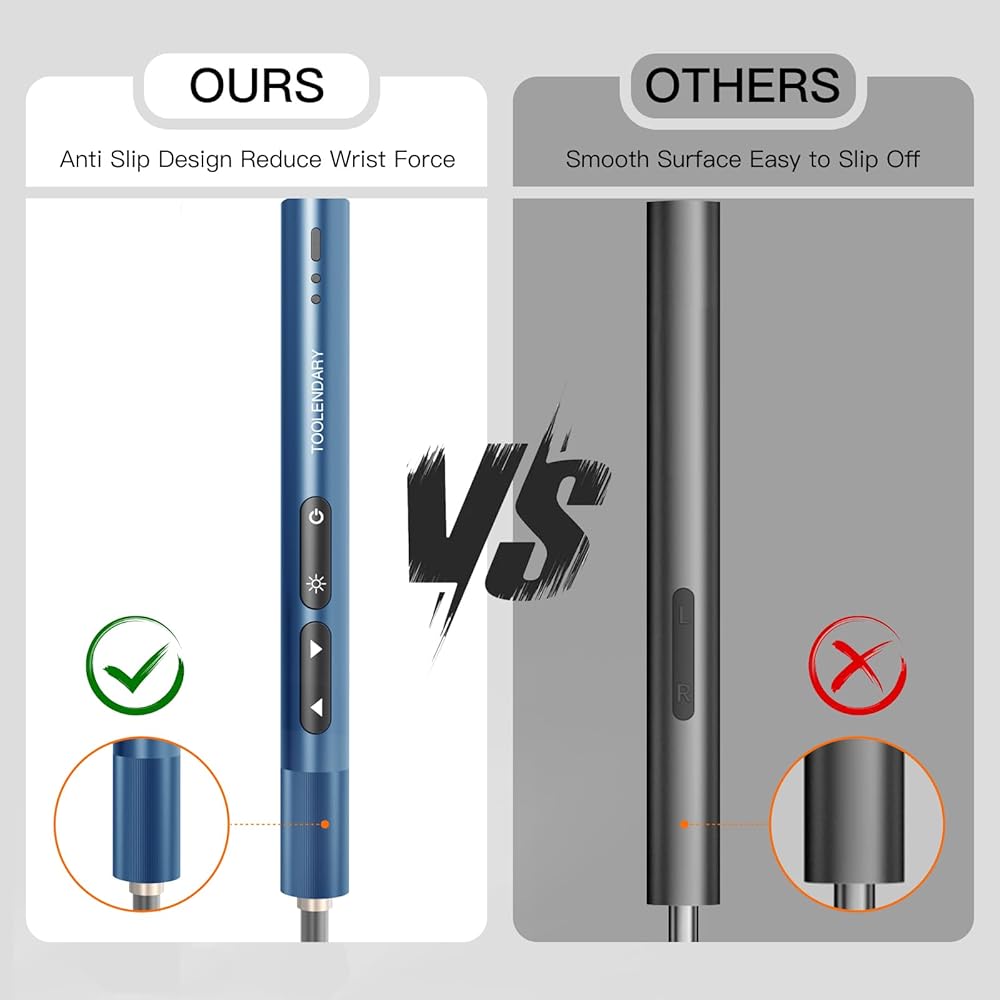 مفكات كهربائية مضادة للانزلاق: تصميم مقبض مفكات كهربائية صغيرة على شكل ترس مضاد للانزلاق، مقبض مفك البراغي يدور بسلاسة ومقابض مضادة للانزلاق من أجل إمساك وتحكم أفضل. يحتوي مفك البراغي على شحن USB مريح، وبطارية طويلة الأمد ومصباح يدوي LED لجعله يعزز الرؤية في ظروف الإضاءة المنخفضة. تأتي مجموعة أدوات مفك البراغي الكهربائية مع صندوق تخزين، ويمكن تخزينها بشكل أفضل دون تناثرها في كل مكان.