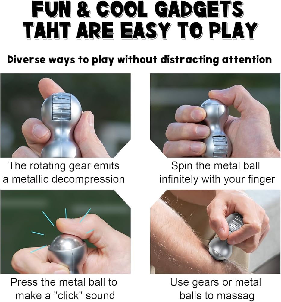 【بسيطة وسهلة اللعب】الألعاب الرائعة سهلة اللعب حتى لا تشتت انتباهك! عندما تقوم بتشغيل الترس، ستصدر ألعاب المكتب صوتًا معدنيًا رائعًا. الكرة عبارة عن كرة معدنية يمكن الضغط عليها وتدويرها. سيصدر صوت "نقر" عند الضغط عليه. وفي الوقت نفسه، فهو أيضًا مساعد جيد للتدليك. ستوفر لك التروس والكرات المعدنية تجربة تدليك مختلفة!