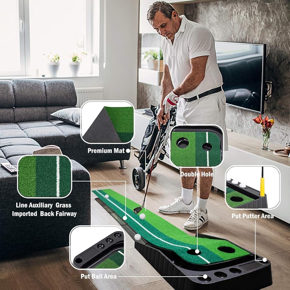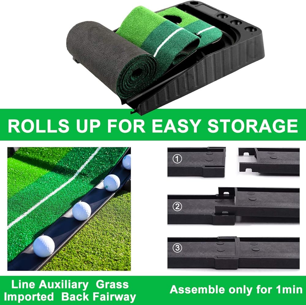 Aliennana Golf Putting Green Mat مع إرجاع الكرة تلقائيًا، مساعد تدريب على ممارسة الجولف، طويل جدًا 9.84 قدم، أخضر احترافي للاستخدام الداخلي/الخارجي مع 4 كرات إضافية حصائر جولف قابلة للطي