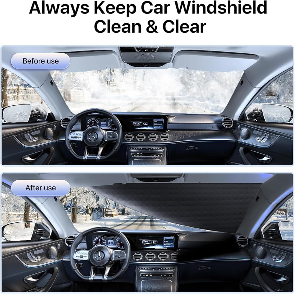 [توافق عالمي] - تغطية أوسع. الحجم القياسي بطول 71 بوصة وارتفاع 48 بوصة، سوف يملأ غطاء الزجاج الأمامي الثلجي الزجاج الأمامي من النهاية إلى النهاية في معظم المركبات الكبيرة. مناسب لسيارات السيدان الكبيرة وسيارات الدفع الرباعي وMPV والشاحنات وسيارات الركاب. (مثل طراز تسلا أو فورد)