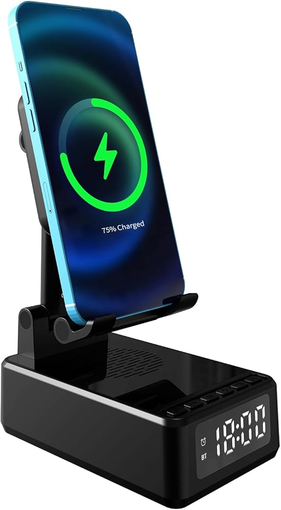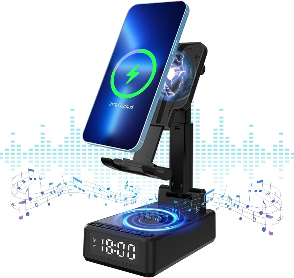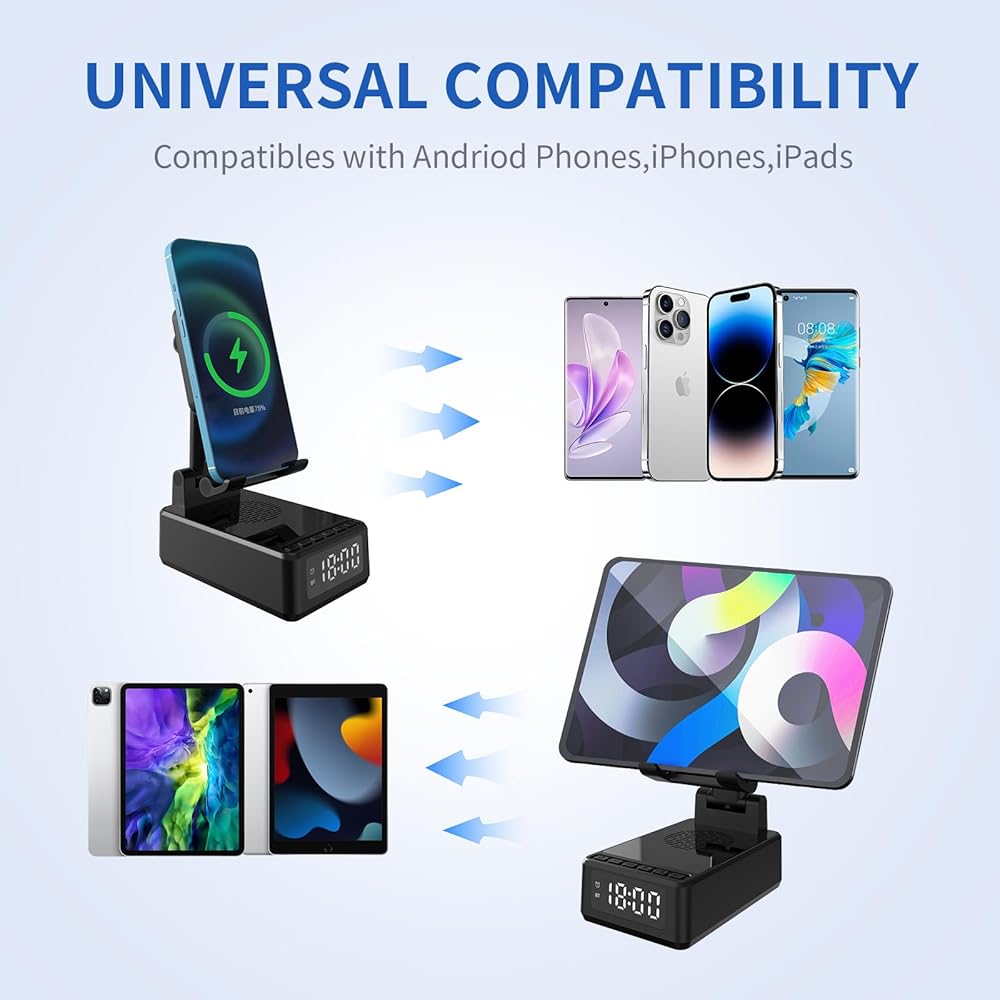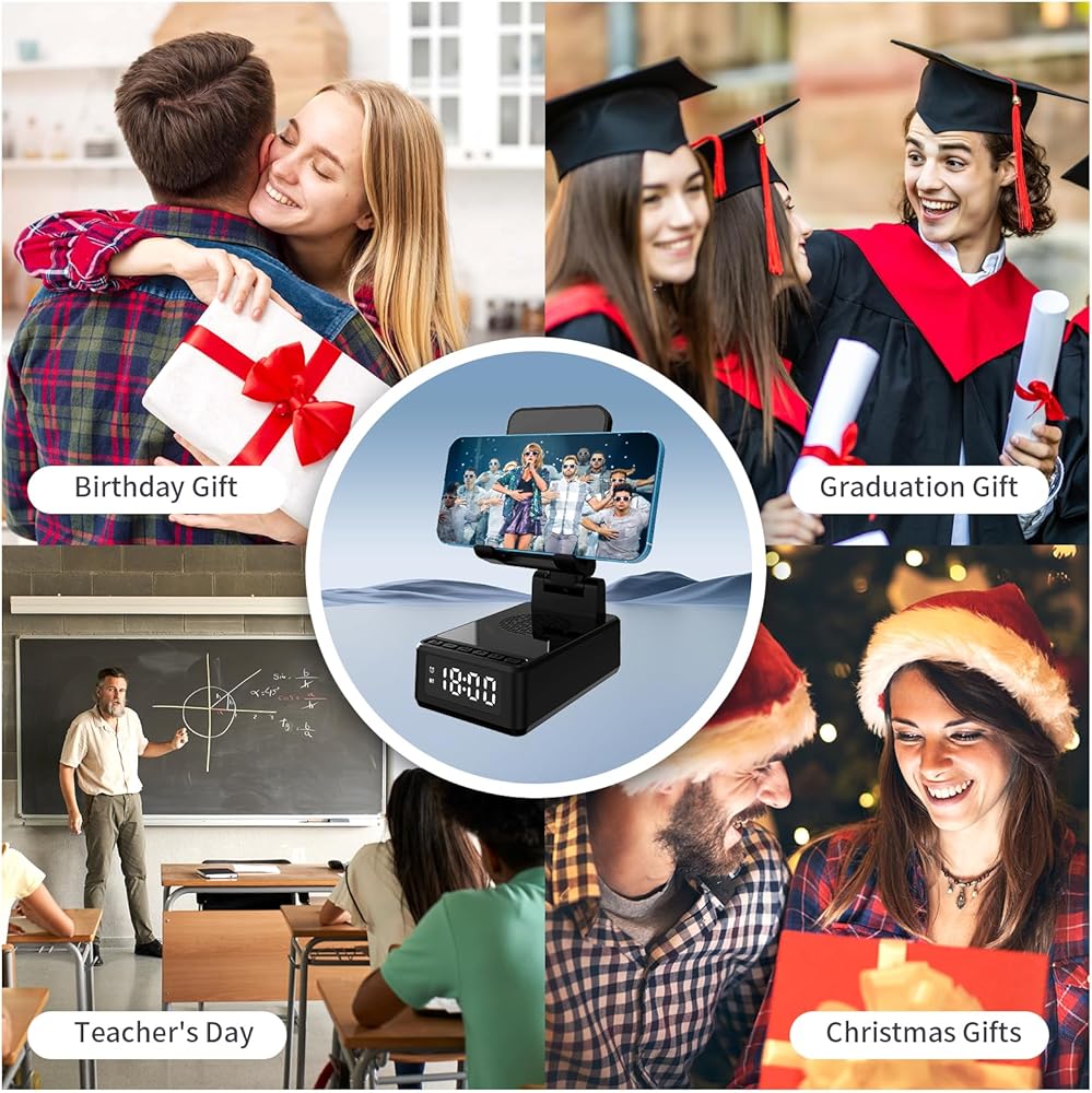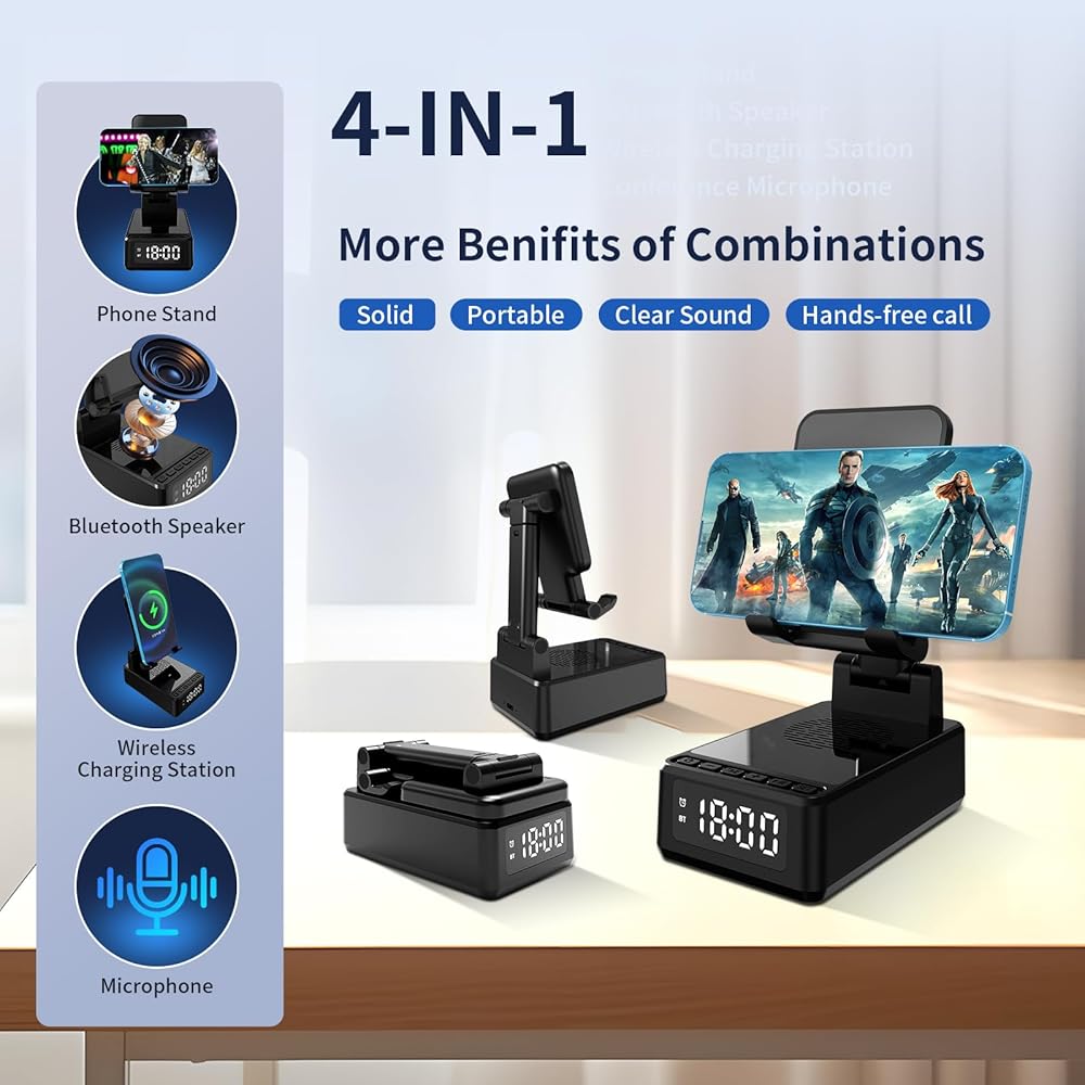 🍓🍓【تصميم وظيفي 4 في 1】 هذا جسم صغير متعدد الوظائف يجمع بين مكبر صوت بلوتوث وشحن لاسلكي 15 وات وساعة وحامل هاتف محمول. يستخدم مكبر صوت بلوتوث للهاتف المحمول صوتًا محيطيًا ثلاثي الأبعاد. يتيح لك الجهير الناعم والصوت الثلاثي الواضح تجربة تجربة السينما المثالية في المنزل.