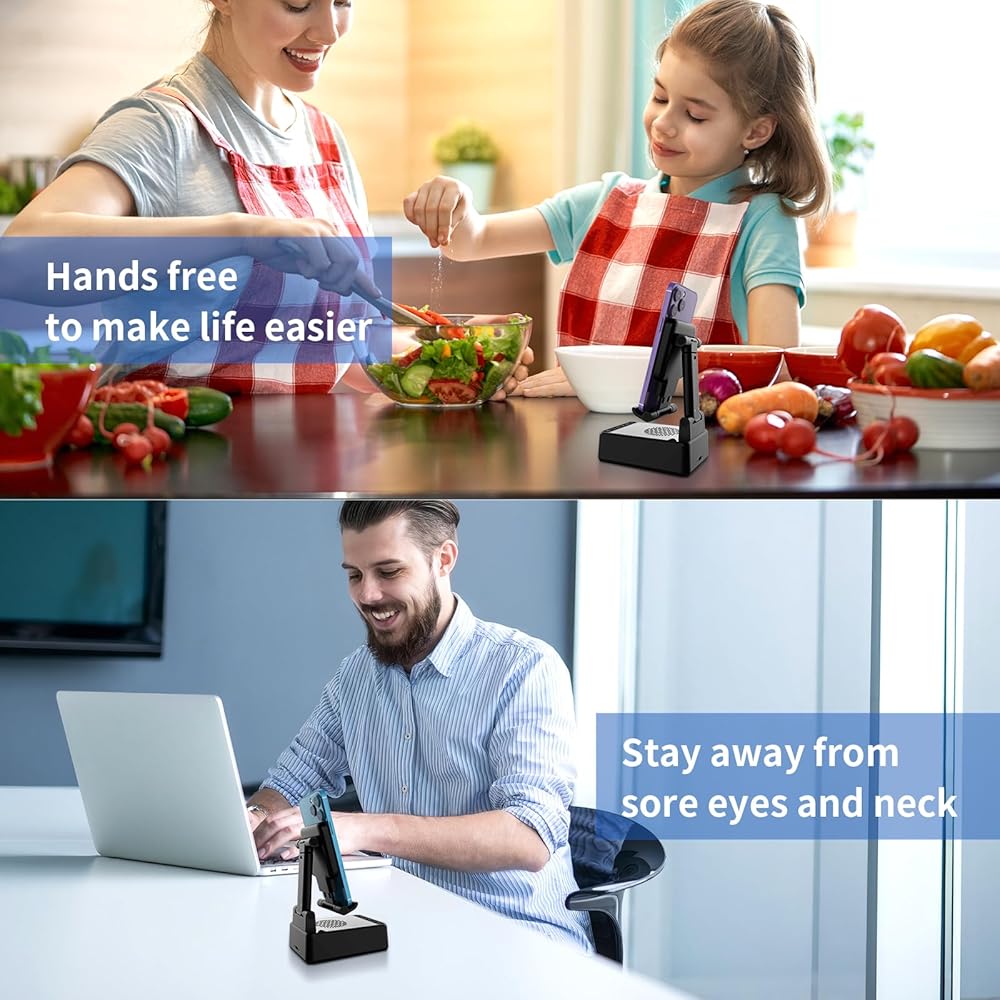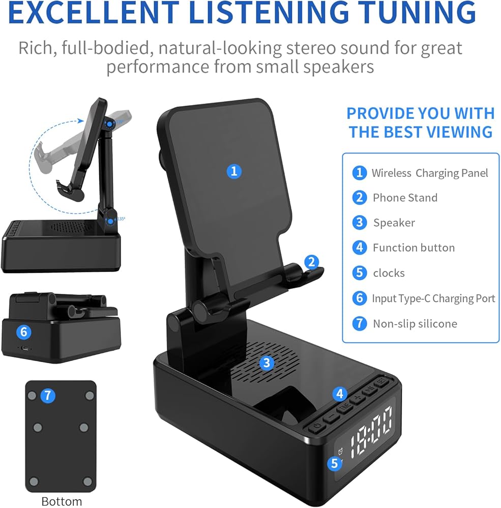 🍓🍓【حامل قابل للتعديل وثبات مضاد للانزلاق】: يمكن طي حامل الهاتف المزود بسماعة بلوتوث بزاوية 90 درجة لمشاهدة متعددة الزوايا، وهو مريح ويحمي العمود الفقري العنقي. مع حامل سطح المكتب هذا، يمكنك مشاهدة هاتفك المحمول أو جهازك اللوحي من أي اتجاه في أي وقت وفي أي مكان. ما هو خاص هو أن الجزء السفلي من حامل هاتف البلوتوث هذا مجهز بـ 6 وسادات سيليكون غير قابلة للانزلاق لحماية هاتفك أو جهازك اللوحي إلى أقصى حد.