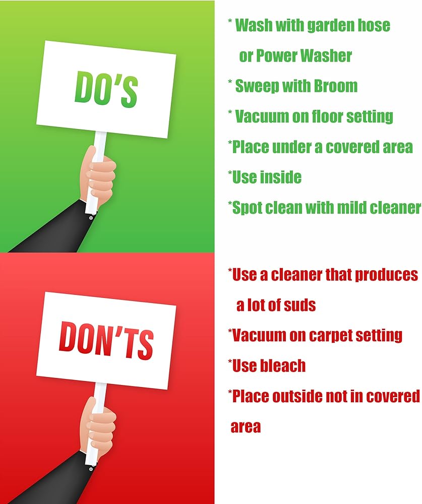 • Easy to Clean: Maintenance is a breeze - simply rinse with a garden hose or use a power washer to eliminate dirt. No suds-producing cleaners necessary. Alternatively, vacuum on floor setting for indoor cleaning.