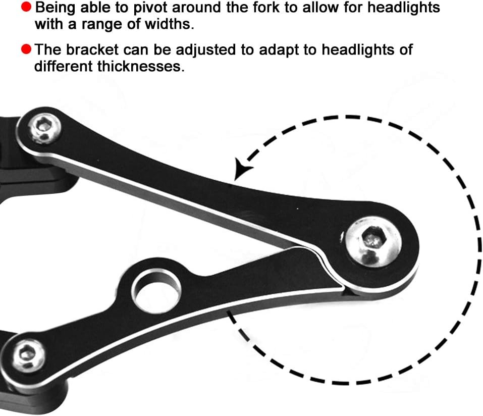 [ Adjustable Design ] --- The bracket can be adjusted to perfectly adapt to various headlights of different thicknesses. Being able to pivot around the fork to allow for headlights with a range of widths.