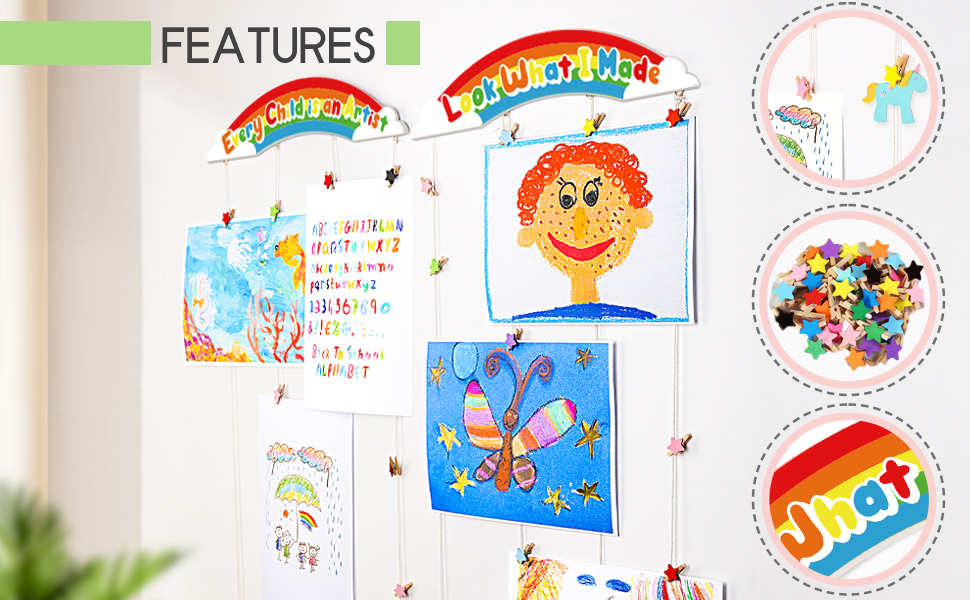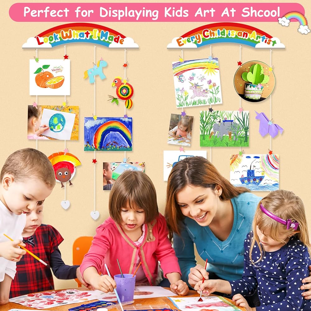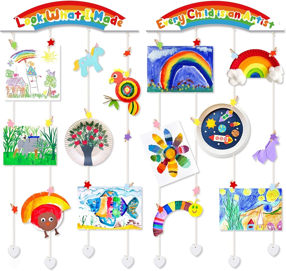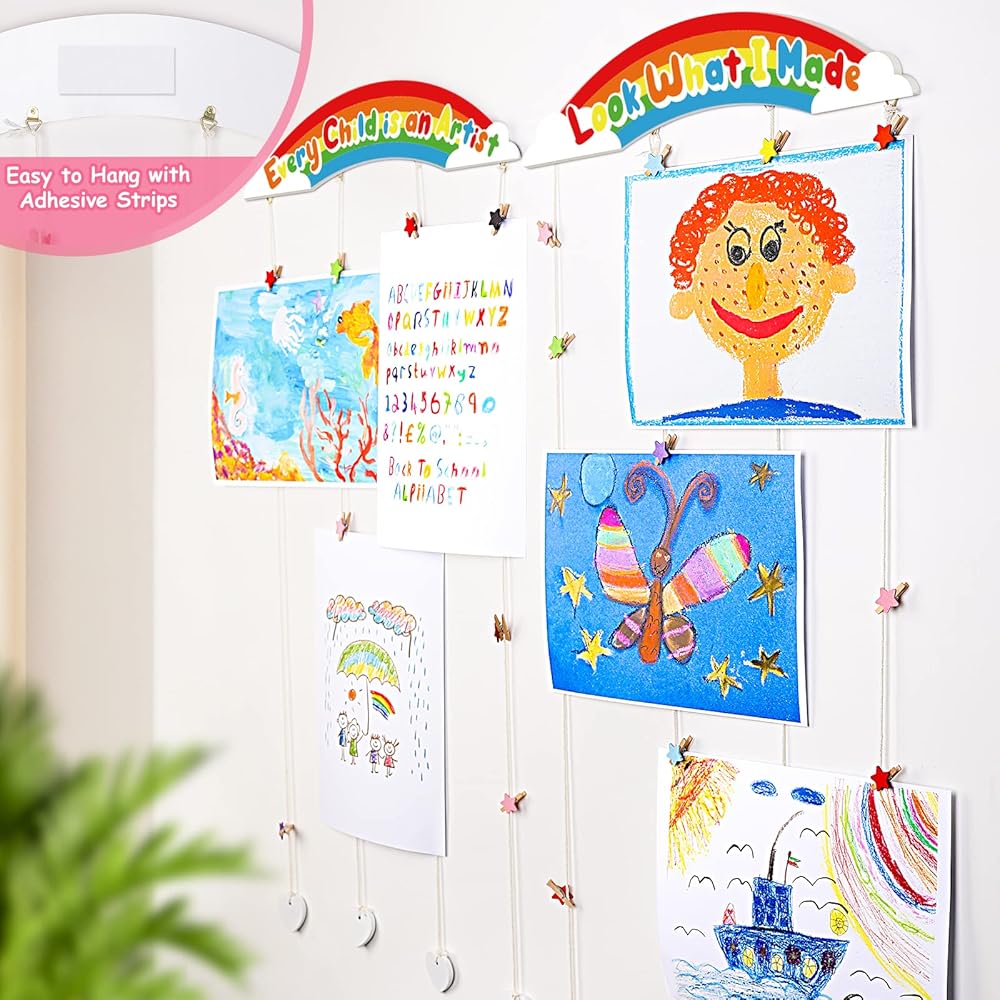 لا تدع ثلاجتك تحصل على كل الأعمال الفنية الجيدة للأطفال! استخدم مجموعة التعليق الفنية التحفيزية من Garybank للأعمال الفنية للأطفال لإظهار موهبة أطفالك! تأتي مجموعة العرض الفنية للأطفال مع علامتين خشبيتين بألوان قوس قزح مع حبال ومشابك ملونة. مطبوعة بكلمات ملهمة "انظر إلى ما صنعته" و"كل طفل فنان"، مما يجعلها طريقة رائعة لعرض جميع إبداعات أطفالك.