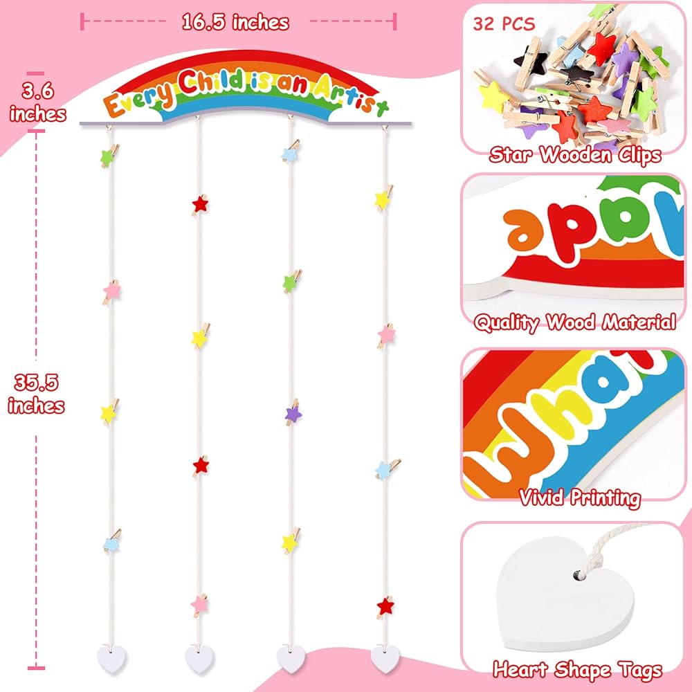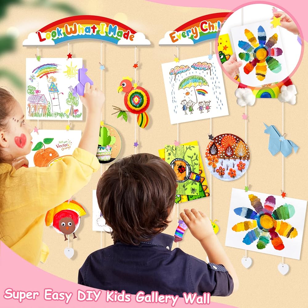 عرض فني للأطفال من Garybank بدون حفر لاصق للجدار، عرض عمل فني للأطفال لحرف رسومات الأطفال، انظر إلى ما صنعته من الخشب مع 32 مشبكًا لديكور غرفة نوم الفتيات (عبوتان)