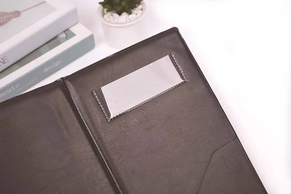• متين وجذاب - يتمتع هذا المقدم بمظهر بني أنيق ومصنوع من الجلد الصناعي المبطن مع حواف معززة مخيطة تعمل معًا لتعزيز مظهر مقدم العرض ومتانته.