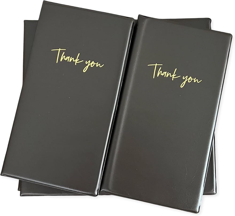 • مستلزمات المطاعم بكميات كبيرة - تعد أدوات تقديم الشيكات الجلدية من مستلزمات المطاعم الأساسية. يتم بيعها بالجملة كحزمة مكونة من 10 قطع من عروض الفواتير.