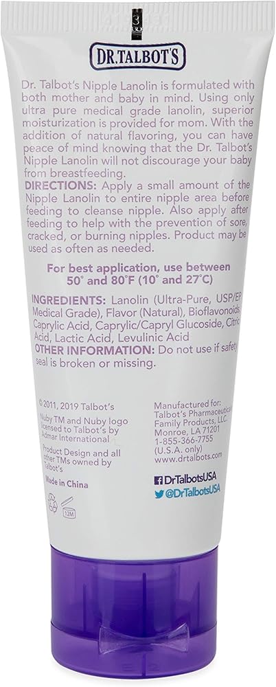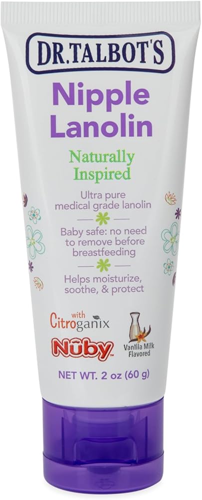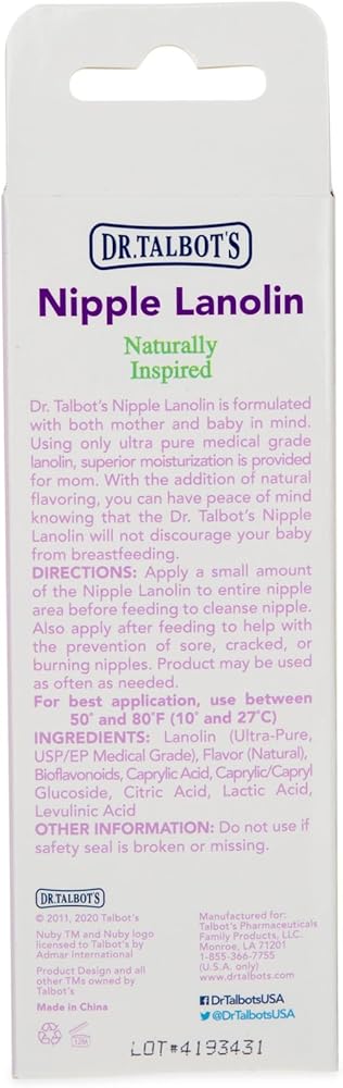 Dr. Talbot's nipple Lanolin is specially formulated to help make nursing comfortable for mom and baby. Lanolin moisturizes and conditions sensitive, chapped nipples and skin, letting mom breastfeed pain-free. With the addition of vanilla Milk flavoring, you can have peace of mind knowing that our nipple Lanolin will not discourage your baby from breastfeeding. Dr. Talbot's uses only the best medical grade Lanolin and no harmful ingredients, so it is safe to use while breastfeeding. Dr. Talbot's nipple Lanolin is multi-purpose, too! Its superior moisturizing properties make it perfect for use on chapped lips, cheeks, dry elbows, and more!