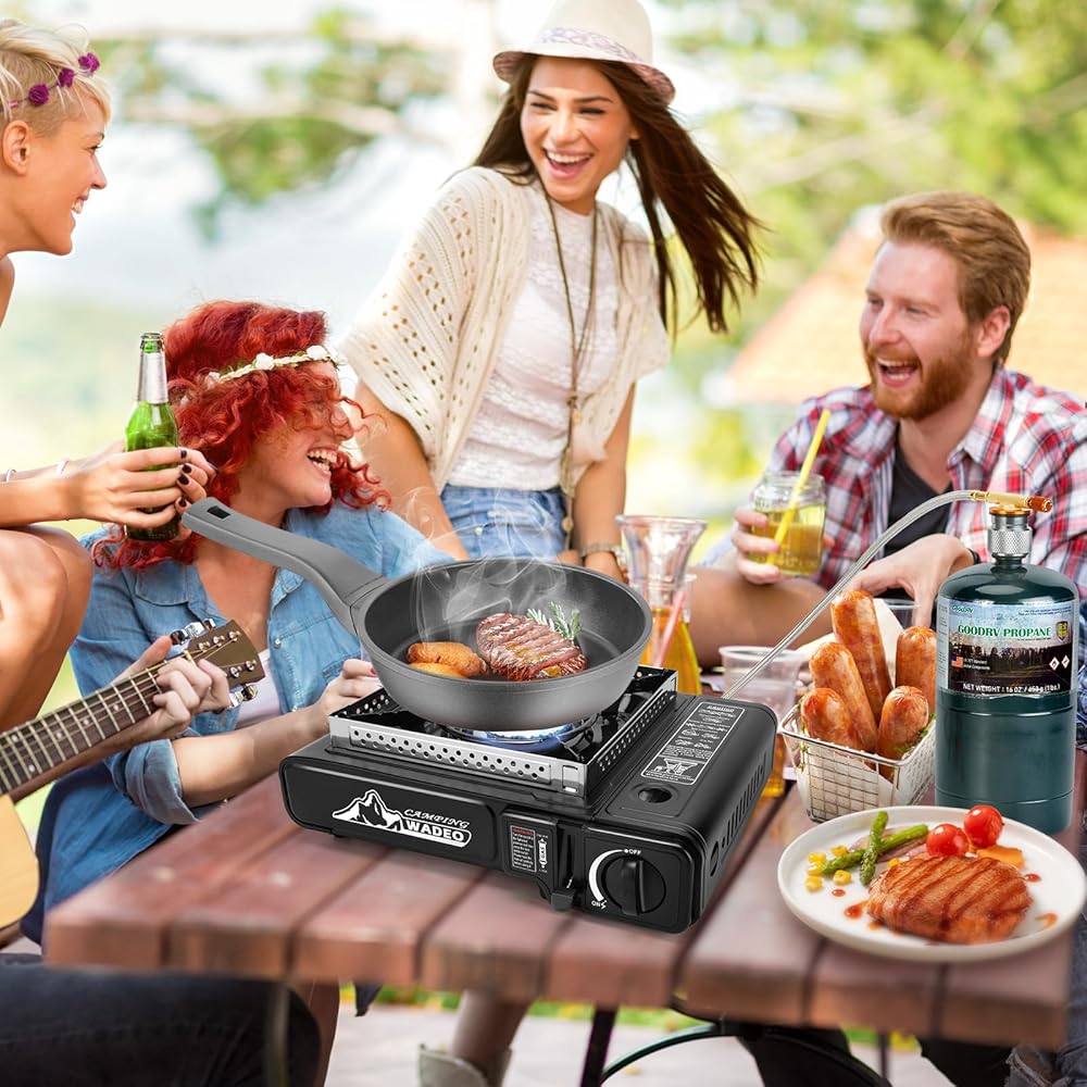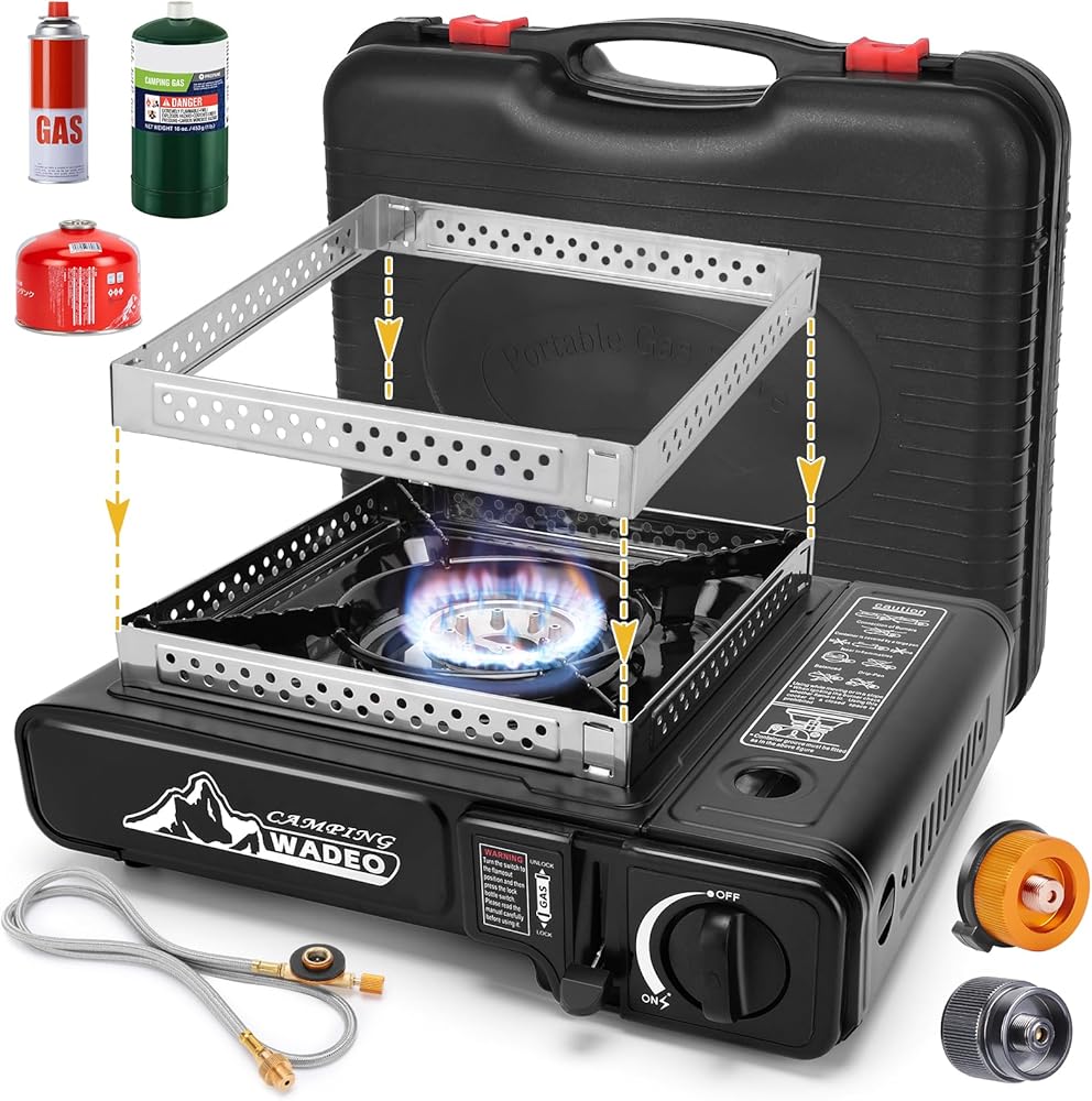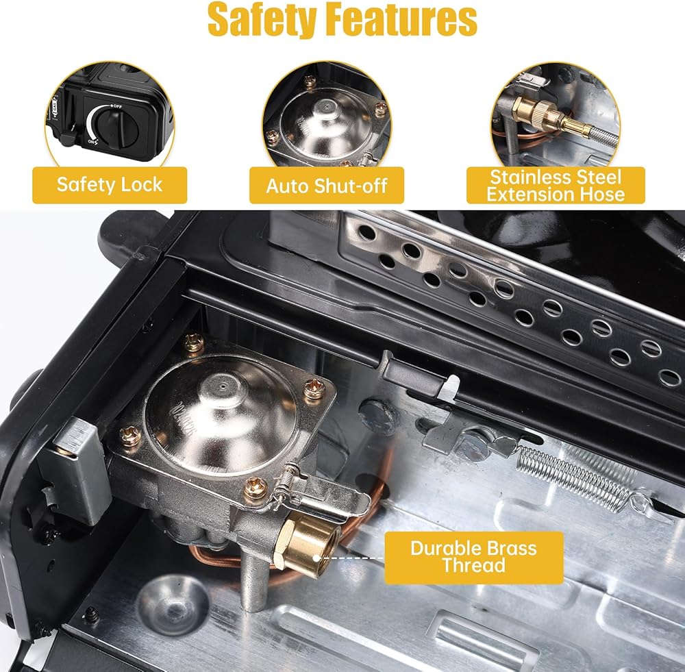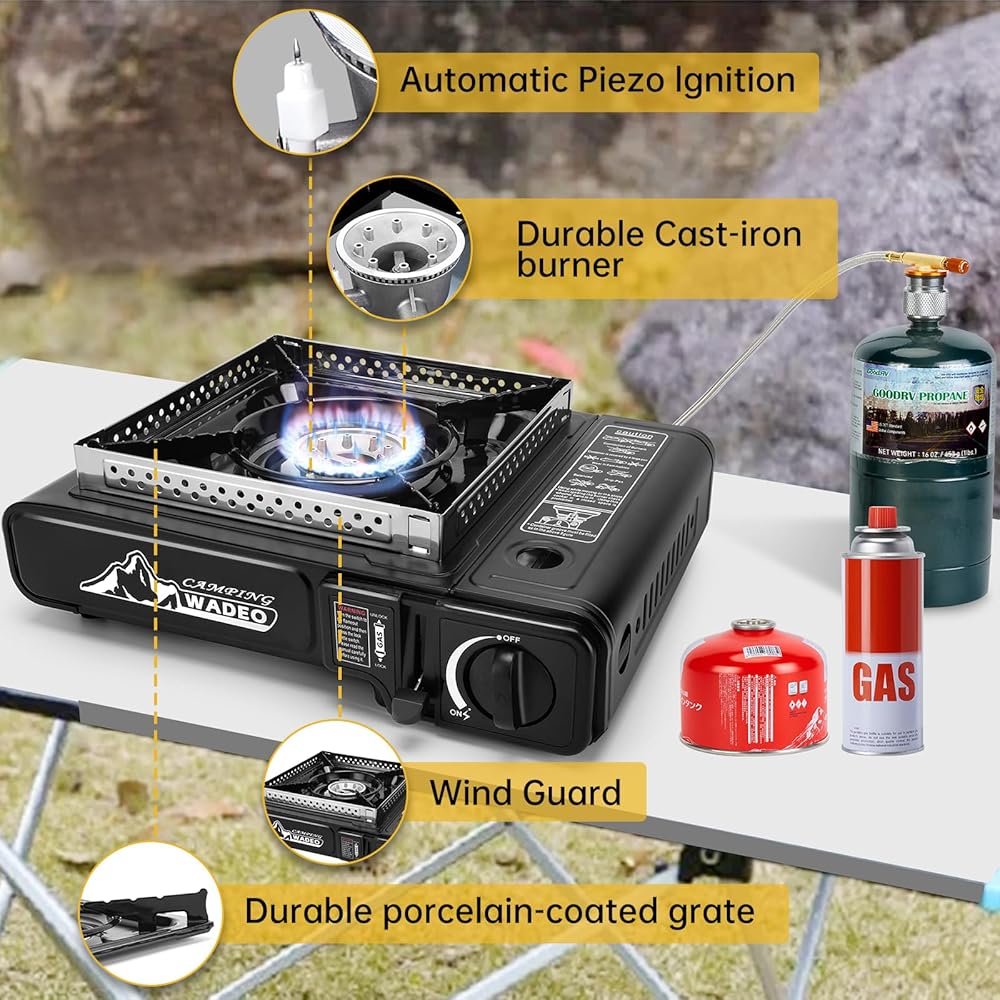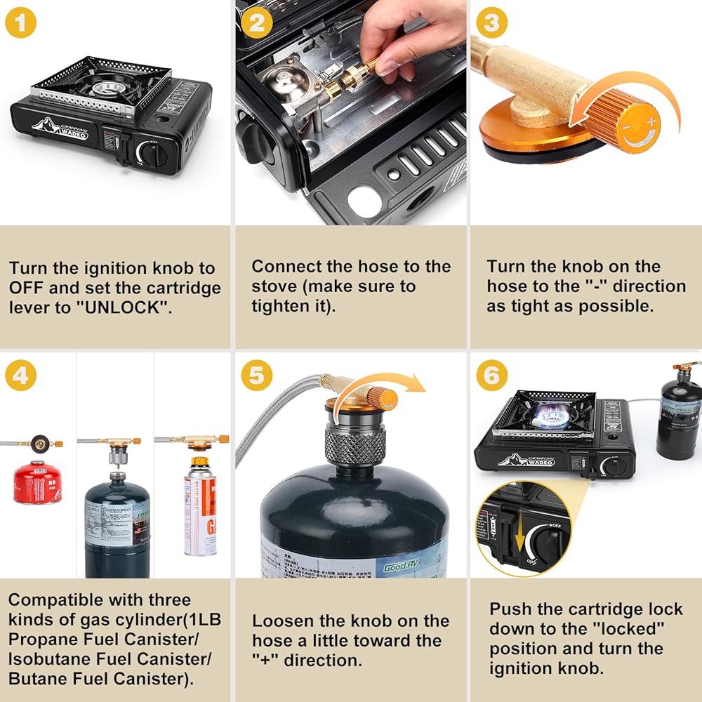 إشعال بيزو والتحكم في اللهب ومفتاح مزدوج: يستخدم الموقد المحمول إشعالًا كهربائيًا بيزو، ولا حاجة لاستخدام أعواد الثقاب أو ولاعات. قم بقفل وضع علبة الغاز وأدر مقبض التحكم إلى النهاية بصوت النقر. يمكنك ضبط حجم اللهب باستخدام المفتاح الموجود على الموقد أو المفتاح الموجود على الخرطوم المجدول المصنوع من الفولاذ المقاوم للصدأ. التوزيع الموحد للهب والاحتراق الكامل للغاز يمكن أن يوفر الوقود.