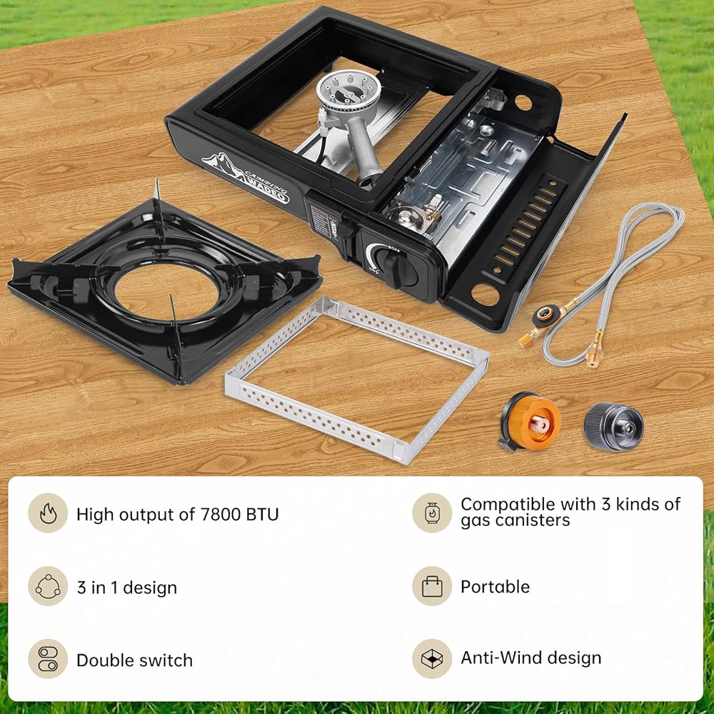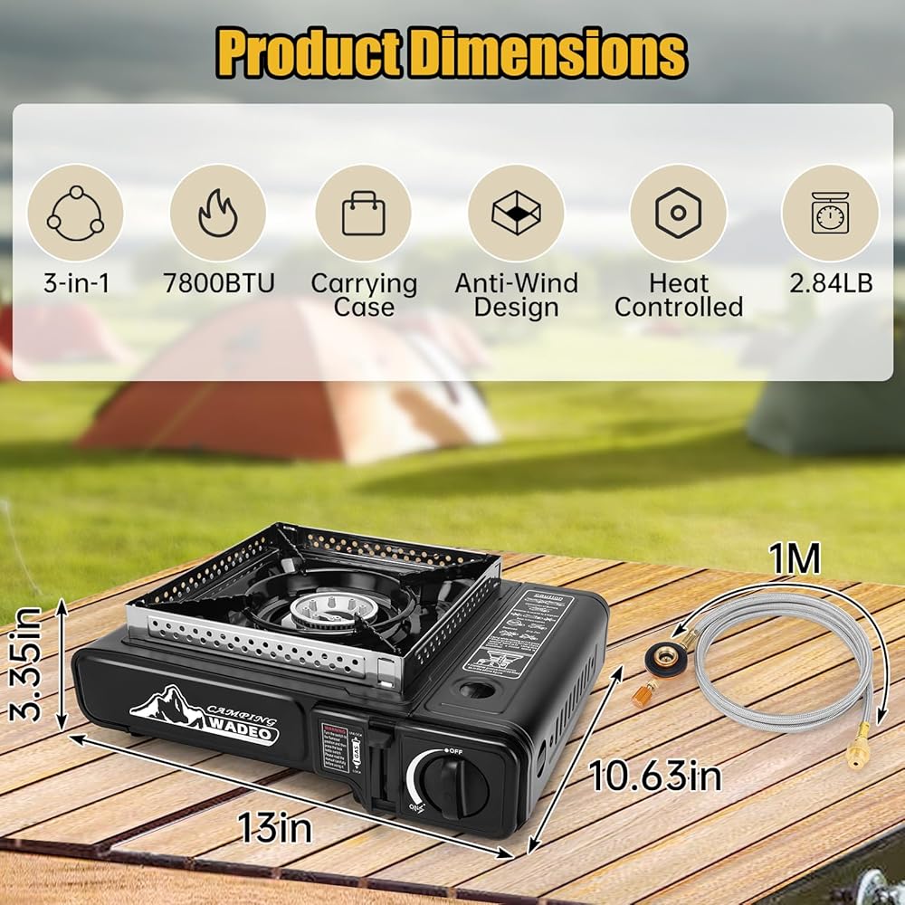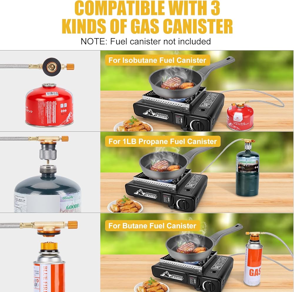 تصميم ثلاثي للوقود: يمكن لموقد التخييم المحمول توصيل علبة بوتان سعة 8 أونصة، أو علبة وقود الأيزوبيوتان 3.53 أونصة أو علبة بروبان سعة 16.4 أونصة. يأتي مع محول وخرطوم لتلبية جميع احتياجاتك من الوقود.