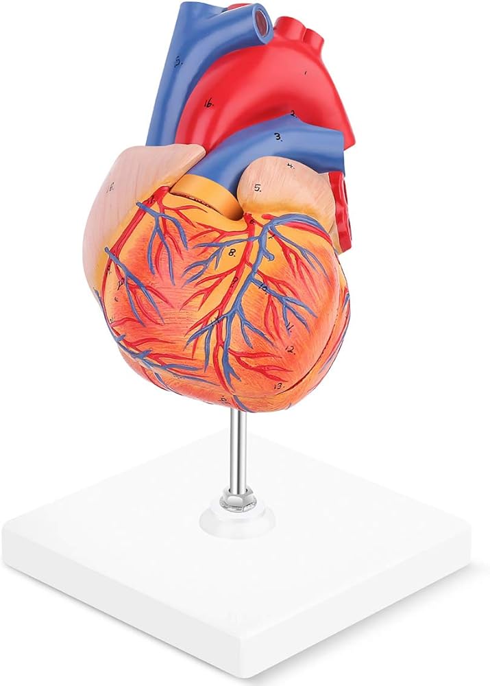 1. Life-size human heart model mounted on a base for use in patient education or anatomical study.