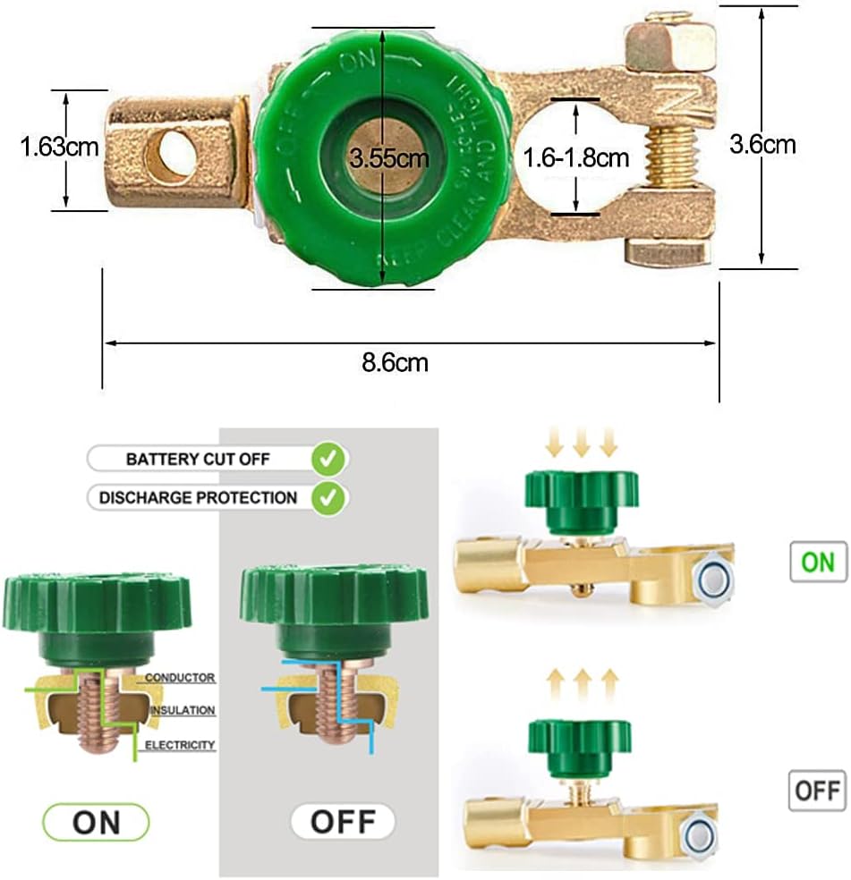 Easy to switch on and off: Turn the green knob a few turns to disconnect or connect the battery. You can also remove the knob to prevent vehicle theft. Much easier than unplugging the battery cable every time