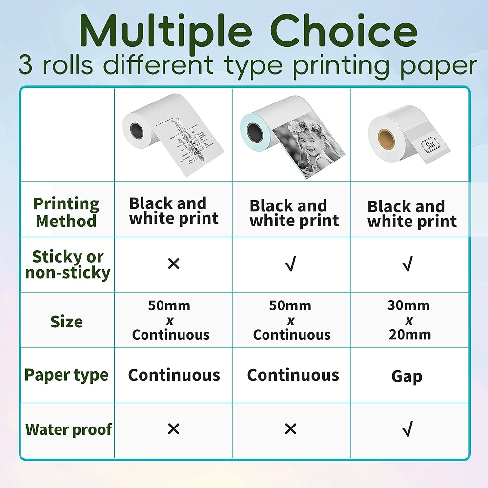 تحتوي على 3 لفات من أنواع مختلفة من الورق: ورق عادي (50 مم*مستمر)، ملصقات (50 مم*مستمر)، ورق ملصقات 20*30 مم، أنواع مختلفة من ورق الطباعة لتلبية احتياجاتك المختلفة.