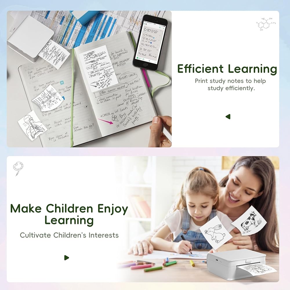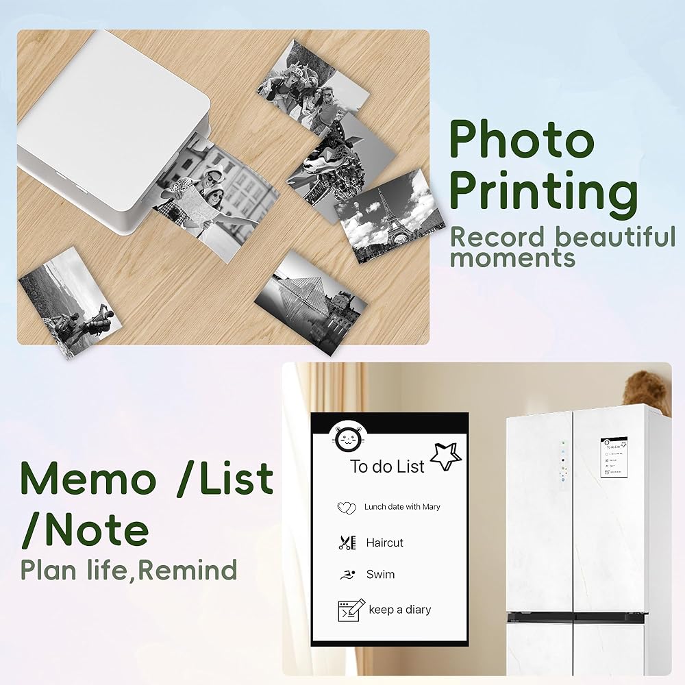 طابعة صغيرة متعددة الوظائف: طابعة صغيرة تطبع باللونين الأبيض والأسود، مناسبة لطباعة الصور والملاحظات والمذكرات وقوائم التسوق ومذكرات التخطيط وملاحظات الدراسة وما إلى ذلك. ويمكنها أيضًا طباعة الملصقات للمساعدة في التنظيم والتصنيف. يمكنك استخدامه في المنزل والمدرسة والمكتب، ومناسب للطلاب والأطفال والمعلمين ويعتبر هدية للجميع.