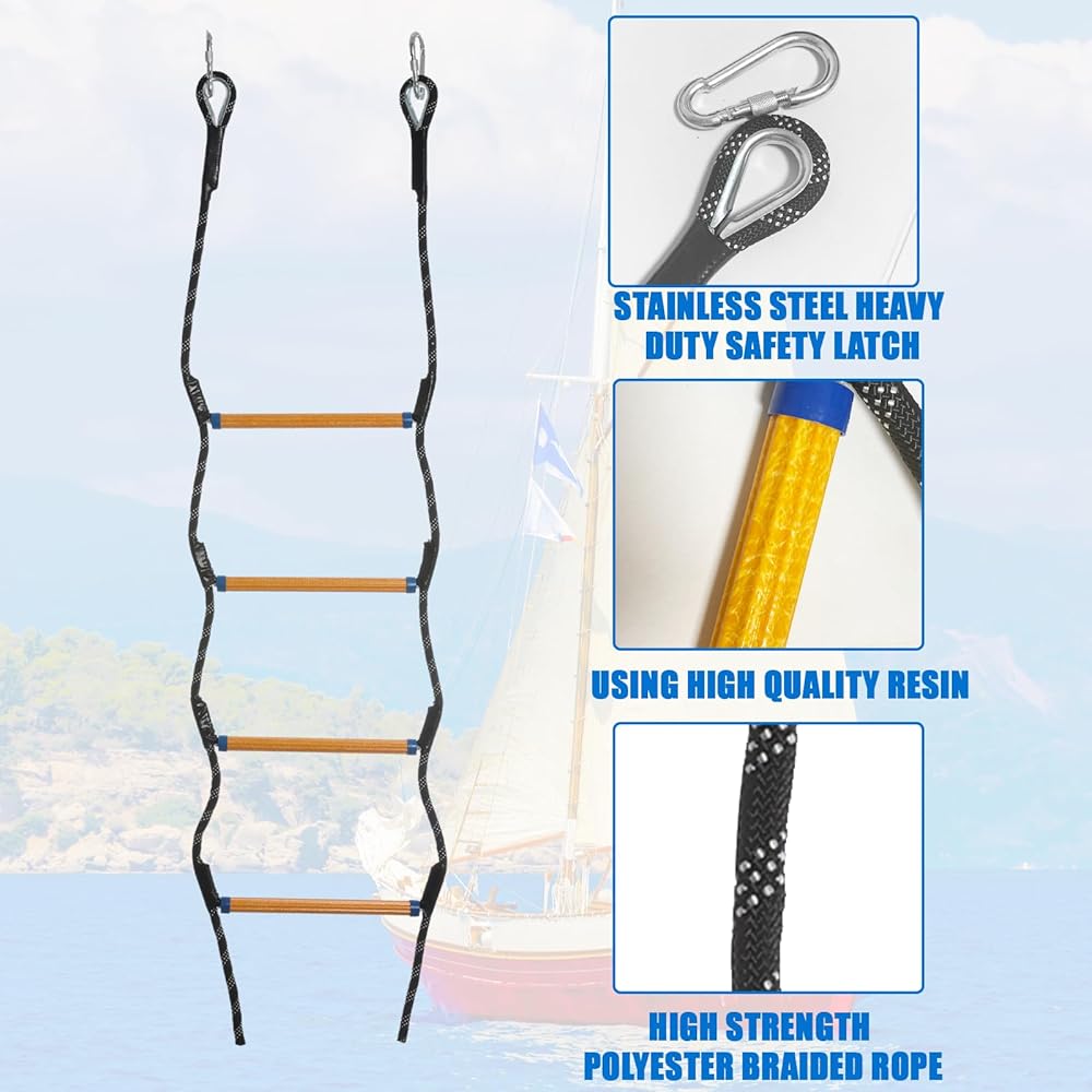 【Safety and Anti-slip】The rope boat ladder uses high strength polyester braided rope, multi-layer splicing for increased friction and the connection to the steps was reinforced. The steps of marine rope ladder are made of resin and adopt octagonal structure design, not easy to slip and stainless steel heavy-duty safety latch to ensure that the rope ladder will not fall off, can be used with confidence.