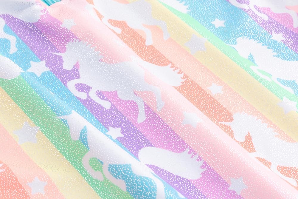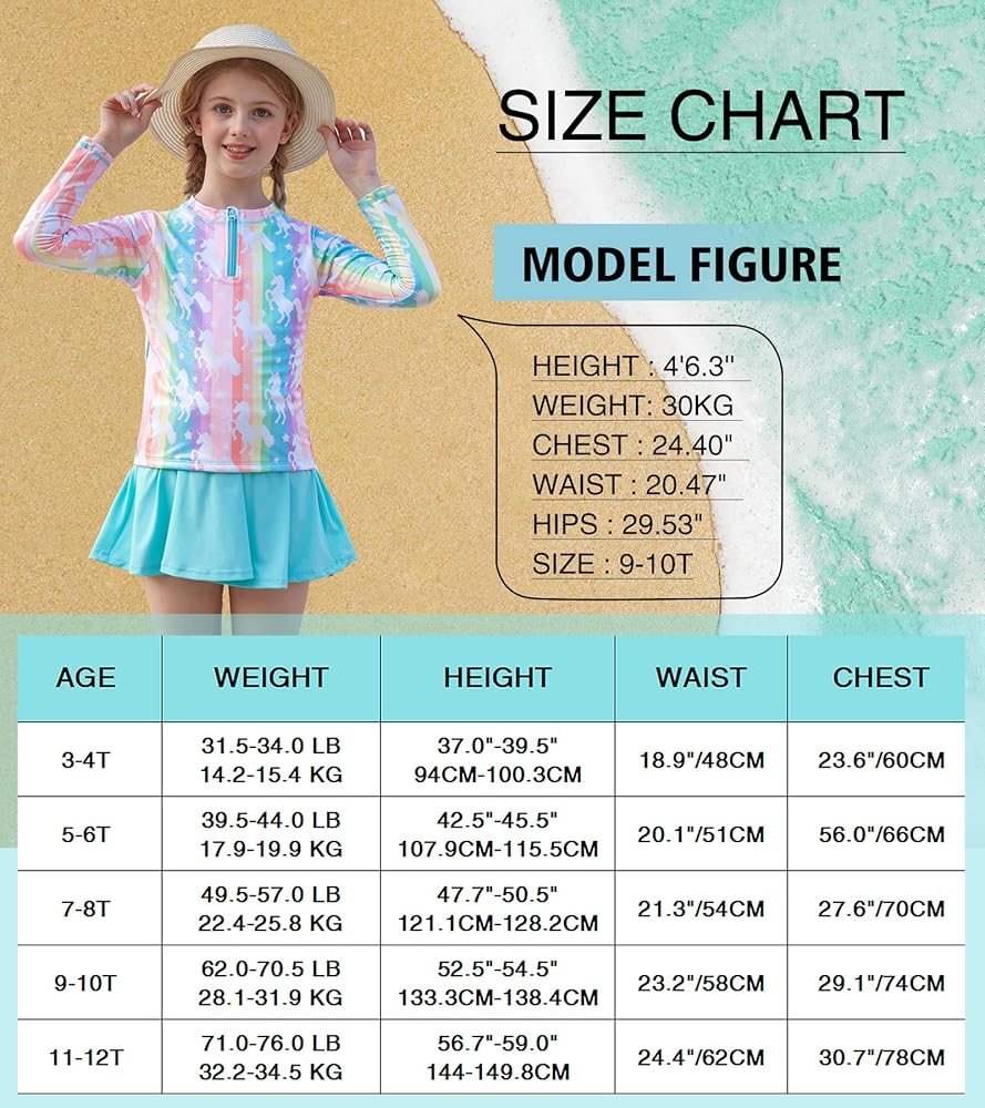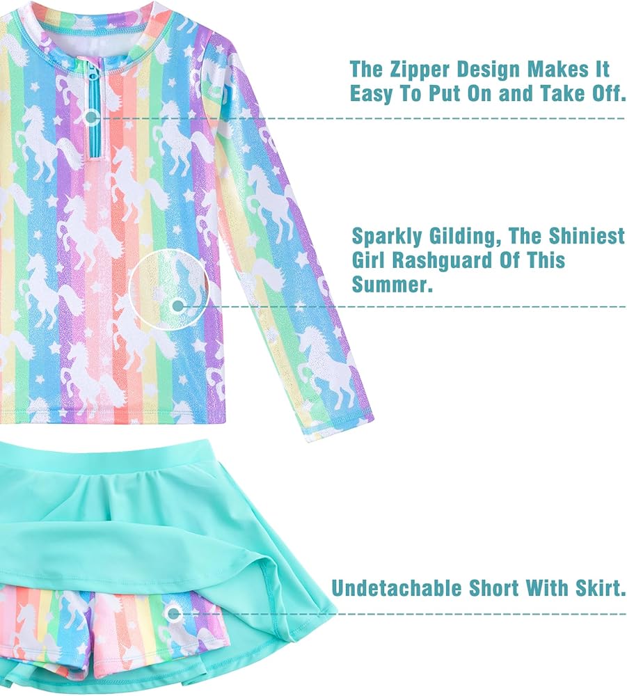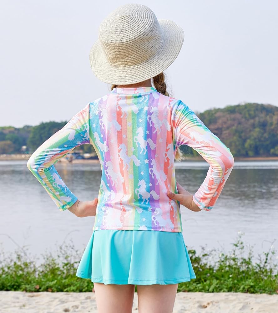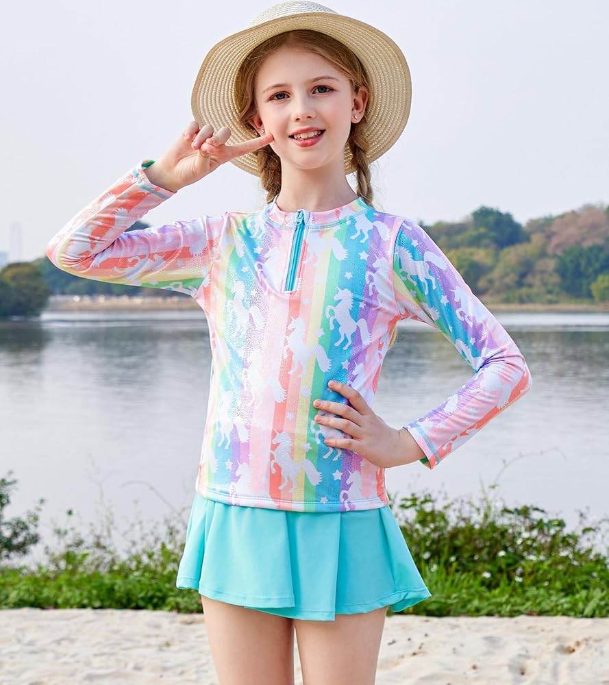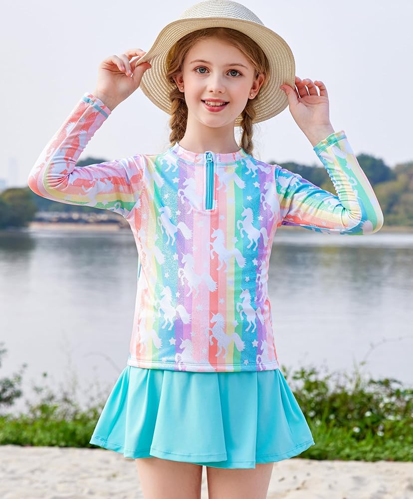 ملابس سباحة للفتيات الصغيرات من قطعتين ملابس سباحة بسحاب بدلة سباحة بألوان قوس قزح بأكمام طويلة وتنورة سباحة مع شورت مقاس 3 4
