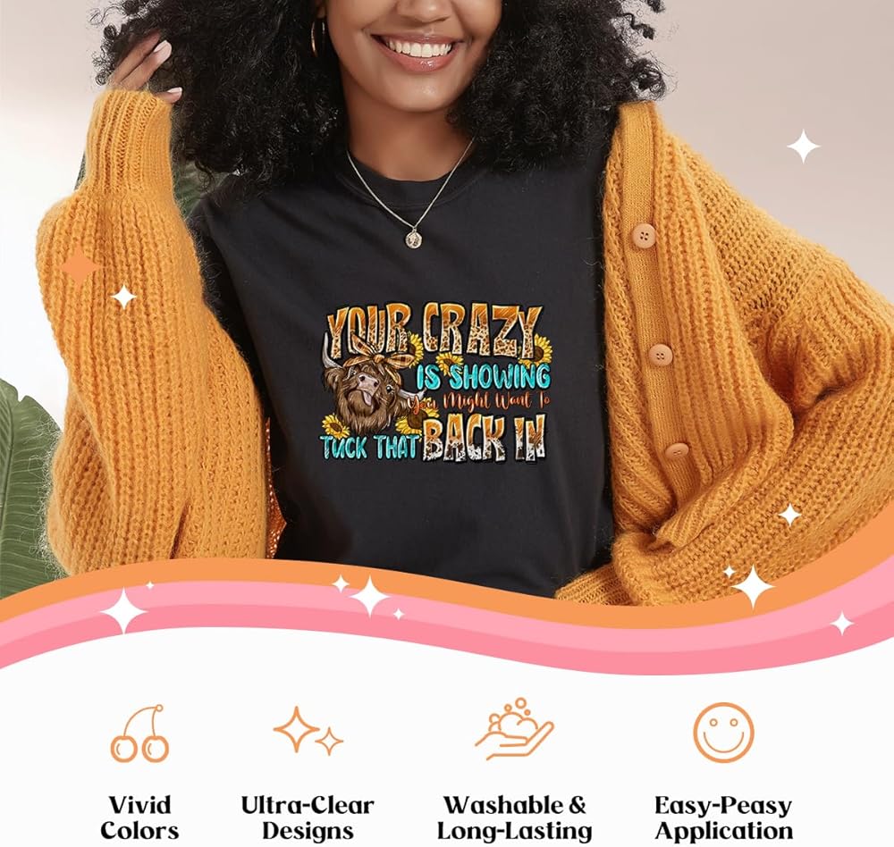 • ألوان زاهية وأنماط واضحة: تتم طباعة فيلم النقل الخاص بنا باستخدام أحبار DTF فائقة الجودة وفيلم نقل عالي الجودة. تأثير الطباعة واضح، نقل ألوان عالي السرعة، ألوان زاهية، أنماط واضحة، قابل للغسل، ملمس ناعم ومتين.