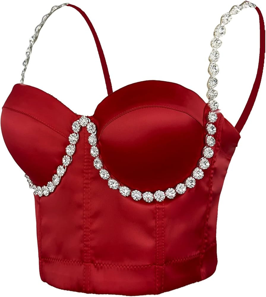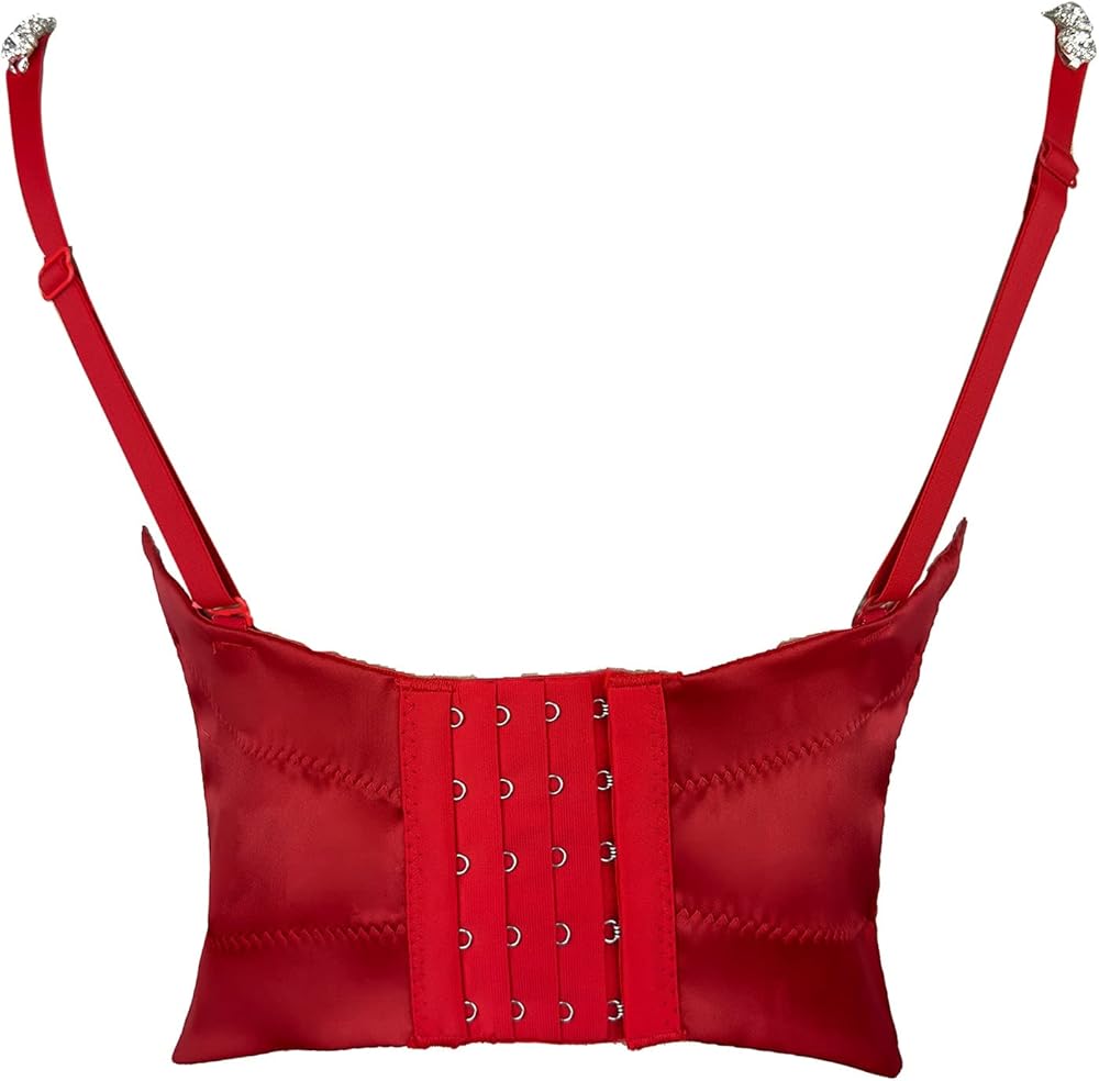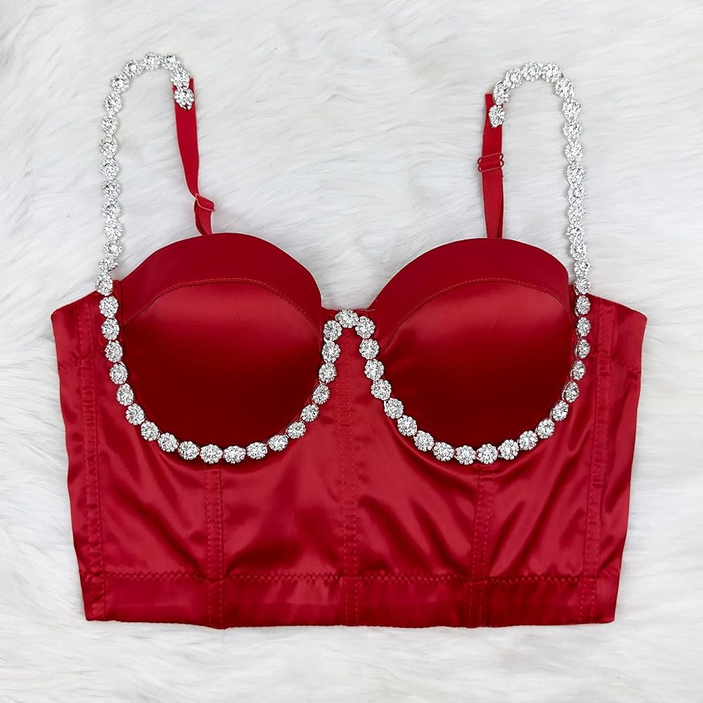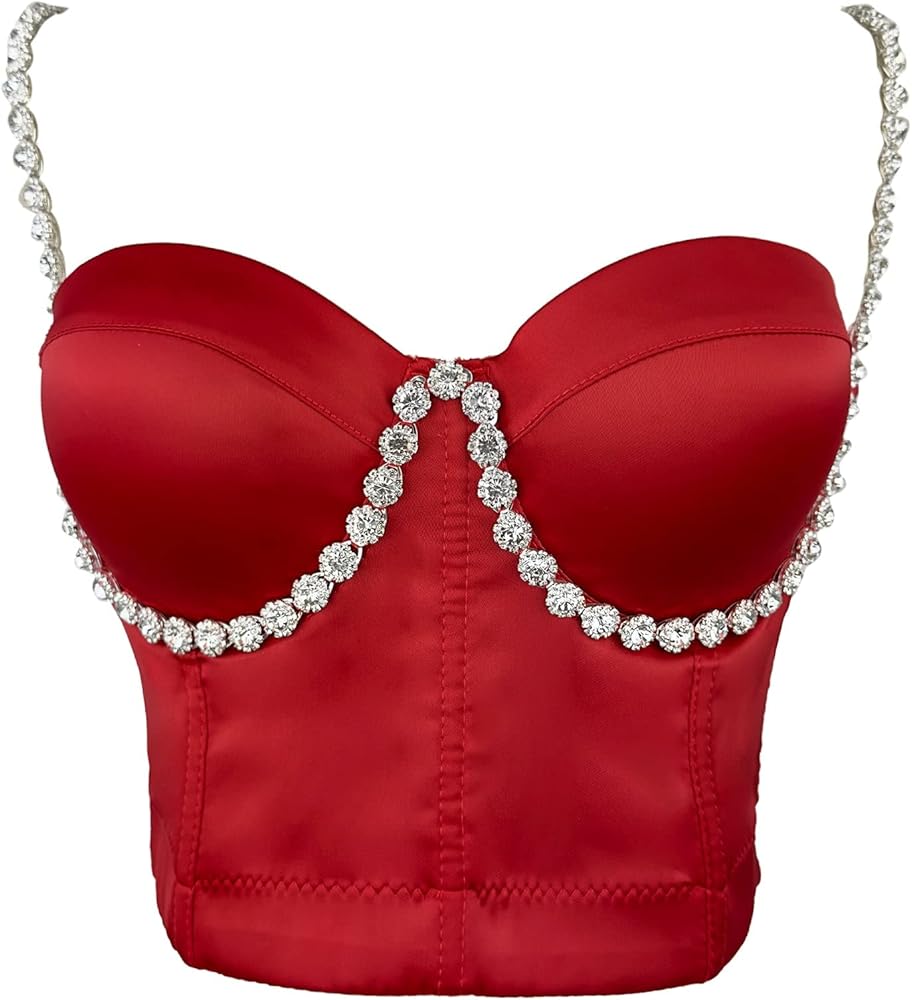 The Red rhinestone diamond shoulder strap bustier is a must-have fashion item for any wardrobe. Crafted from luxurious satin fabric, its shiny surface catches the light and draws attention to the diamond rhinestone floral embellishments that adorn the cups and extend all the way to the straps. Perfect for parties, gatherings, and everyday wear, this tos is sure to enhance your charm and confidence. Don't miss out on the chance to add a touch of sparkle to your look!