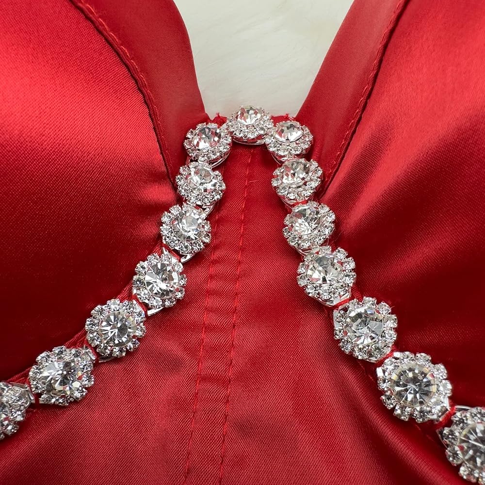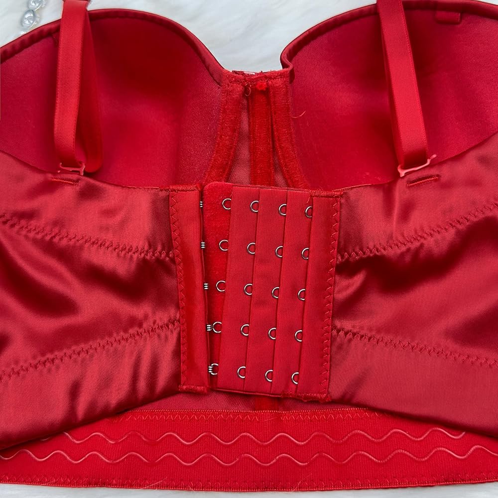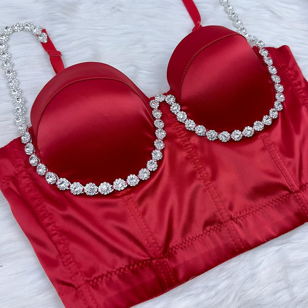 The Red rhinestone diamond shoulder strap bustier is a must-have fashion item for any wardrobe. Crafted from luxurious satin fabric, its shiny surface catches the light and draws attention to the diamond rhinestone floral embellishments that adorn the cups and extend all the way to the straps. Perfect for parties, gatherings, and everyday wear, this tos is sure to enhance your charm and confidence. Don't miss out on the chance to add a touch of sparkle to your look!