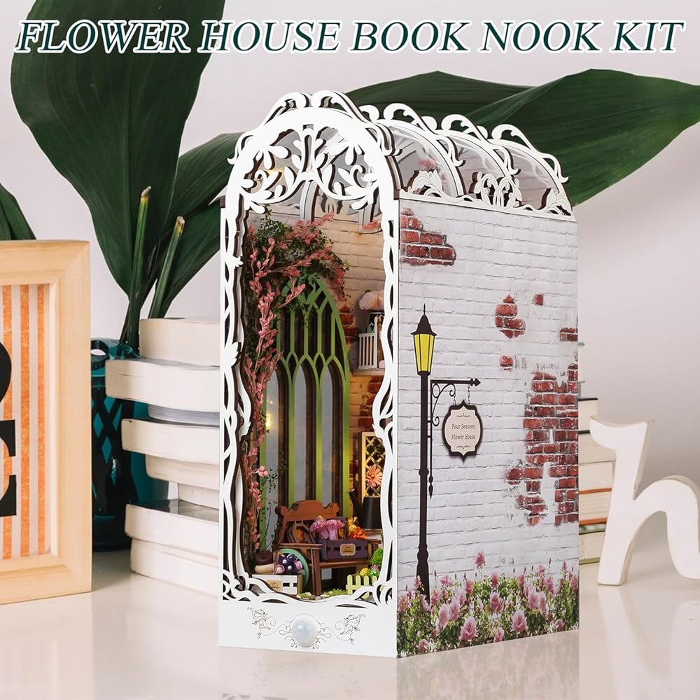مجموعة TuKIIE DIY Book Nook Miniature Kit، رف الكتب Booknook Dollhouse مع ضوء مستشعر ومقاوم للغبار، مجموعات نماذج حامل الكتب المزخرفة الخشبية للأطفال والمراهقين والبالغين (بيت الزهور)