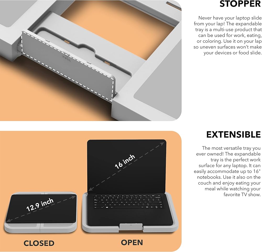 تُعد الصينية القابلة للتوسيع إكسسوارًا مثاليًا لإضافتها إلى مساحة العمل أو معدات السفر. يعمل كمسند للذراعين وكحامل للكمبيوتر المحمول والكتب والأجهزة المسطحة. يمكنك العمل عليها وتناول الطعام عليها واستخدامها أيضًا كطاولة صغيرة لتخزين الأشياء الصغيرة