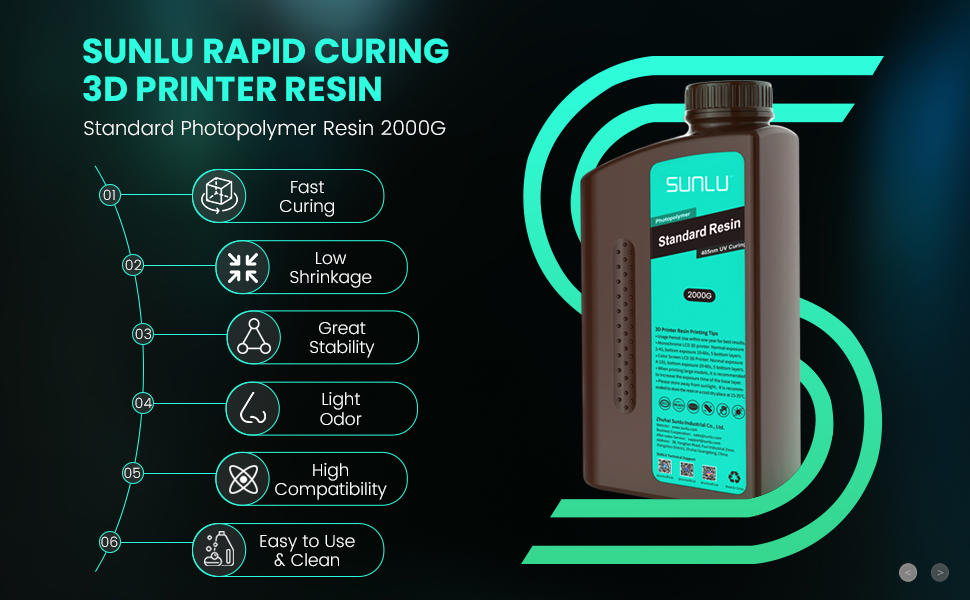 ⑤【تغليف آمن ومضاد للتسرب】- يحتوي راتنج البوليمر الضوئي القياسي SUNLU على عبوة آمنة مع تصميم زجاجة مانعة للتسرب. تقليل خطر كسر الغطاء وتسرب الراتنج ثلاثي الأبعاد. الزجاجة محاطة بكيس هوائي محكم. لا تقلق بشأن التسرب أثناء النقل.