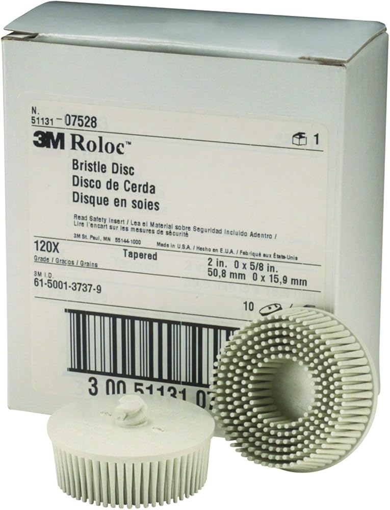 Scotch-Brite Roloc Bristle Disc, using proprietary ceramic abrasive grain blended with aluminum oxide and molded, flexible bristles, provide more surface contact than wire brushes and retain abrasive properties throughout the life of the disc. Molded, abrasive filled bristles strip, deburr, blend, finish, polish, clean, and remove coatings more effectively than wire brushes. Proprietary 3M Ceramic Abrasive Grain blend provides high degree of finish quality throughout the life of the disc. Bristle spacing is ideal for coating removal and other high-loading substances. Flexible bristles conform to contours to produce consistent finishes, even on complex parts. Convenient 3M Roloc attachment system offers quick and easy disc change-out for multi-step finishing processes.