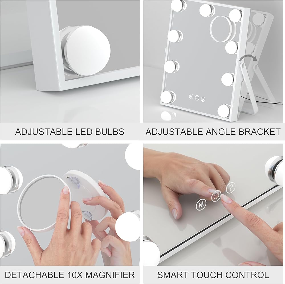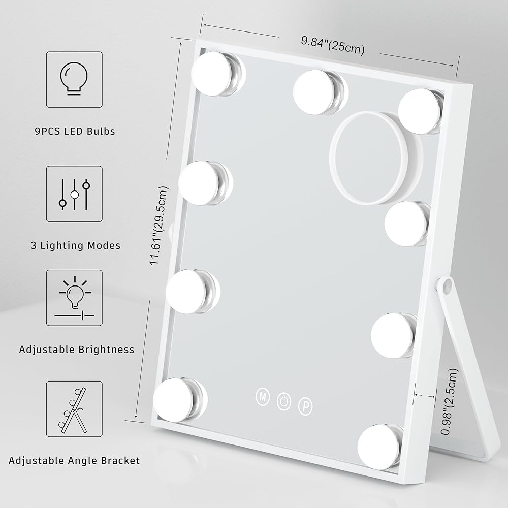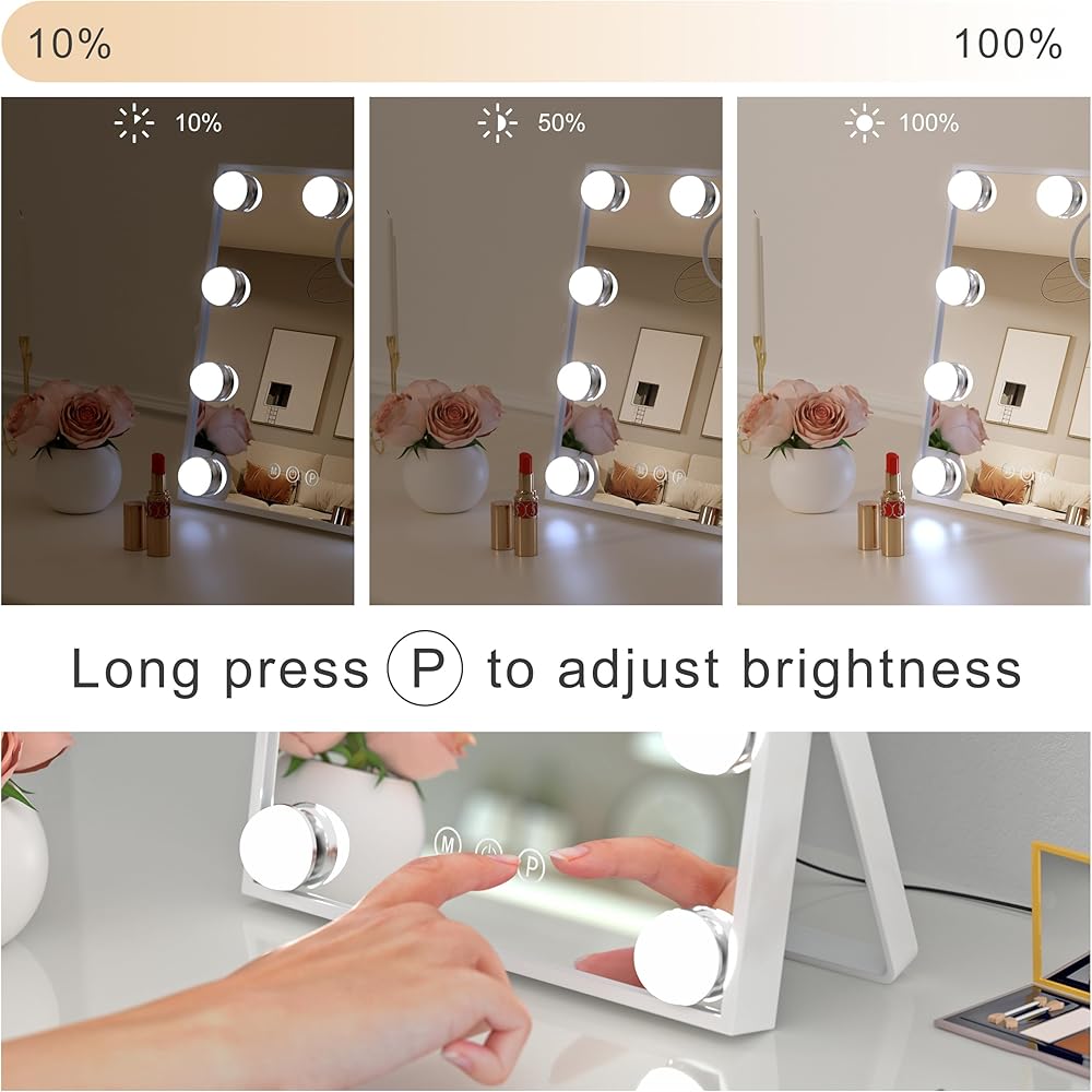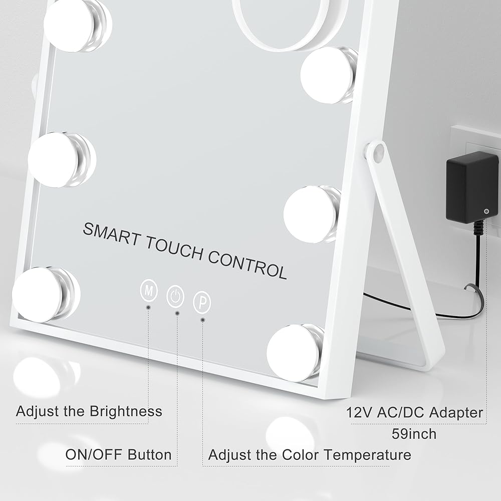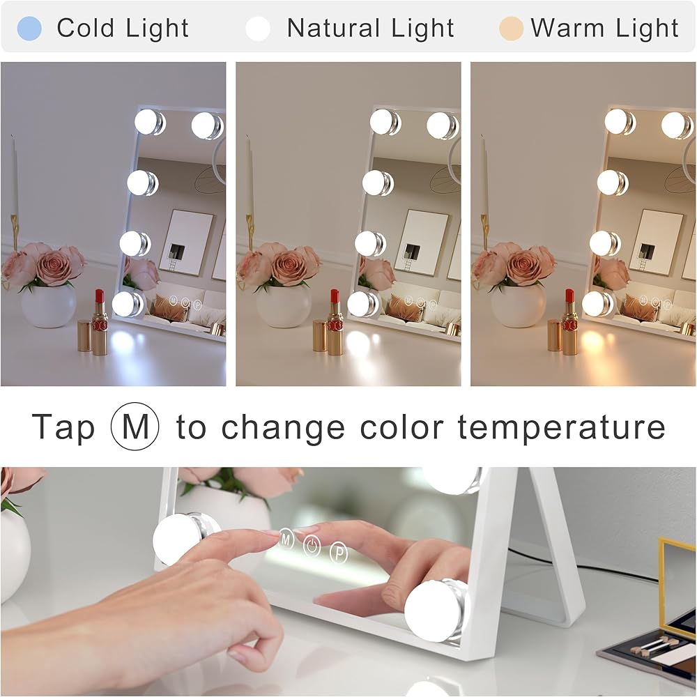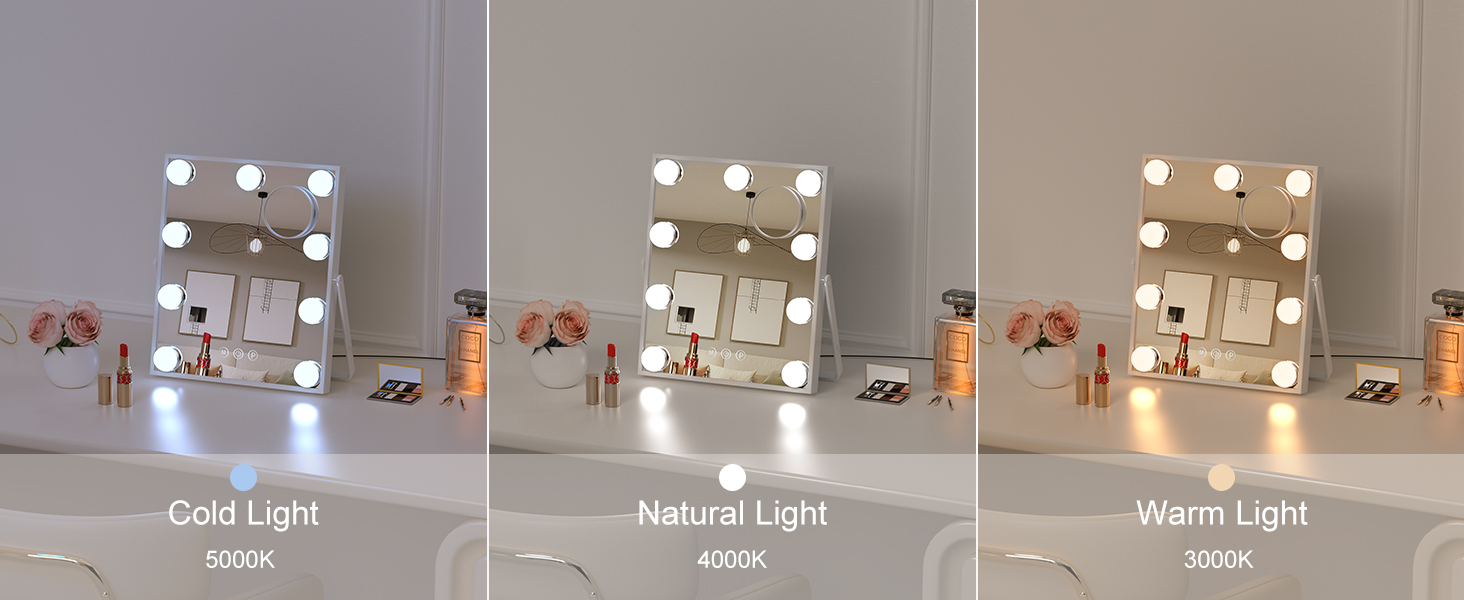 تتميز مرآة هوليوود المزودة بمصابيح بتحكم باللمس، مما يدعمك لضبط السطوع من 5% إلى 100% وتغيير 3 ألوان من الضوء من الضوء الأصفر البارد/الطبيعي/الدافئ. بفضل 9 مصابيح LED، فإنها تضيء كل جزء على وجهك بالتساوي، وبالتالي يمكنك رؤية ملامح الوجه بوضوح كبير.