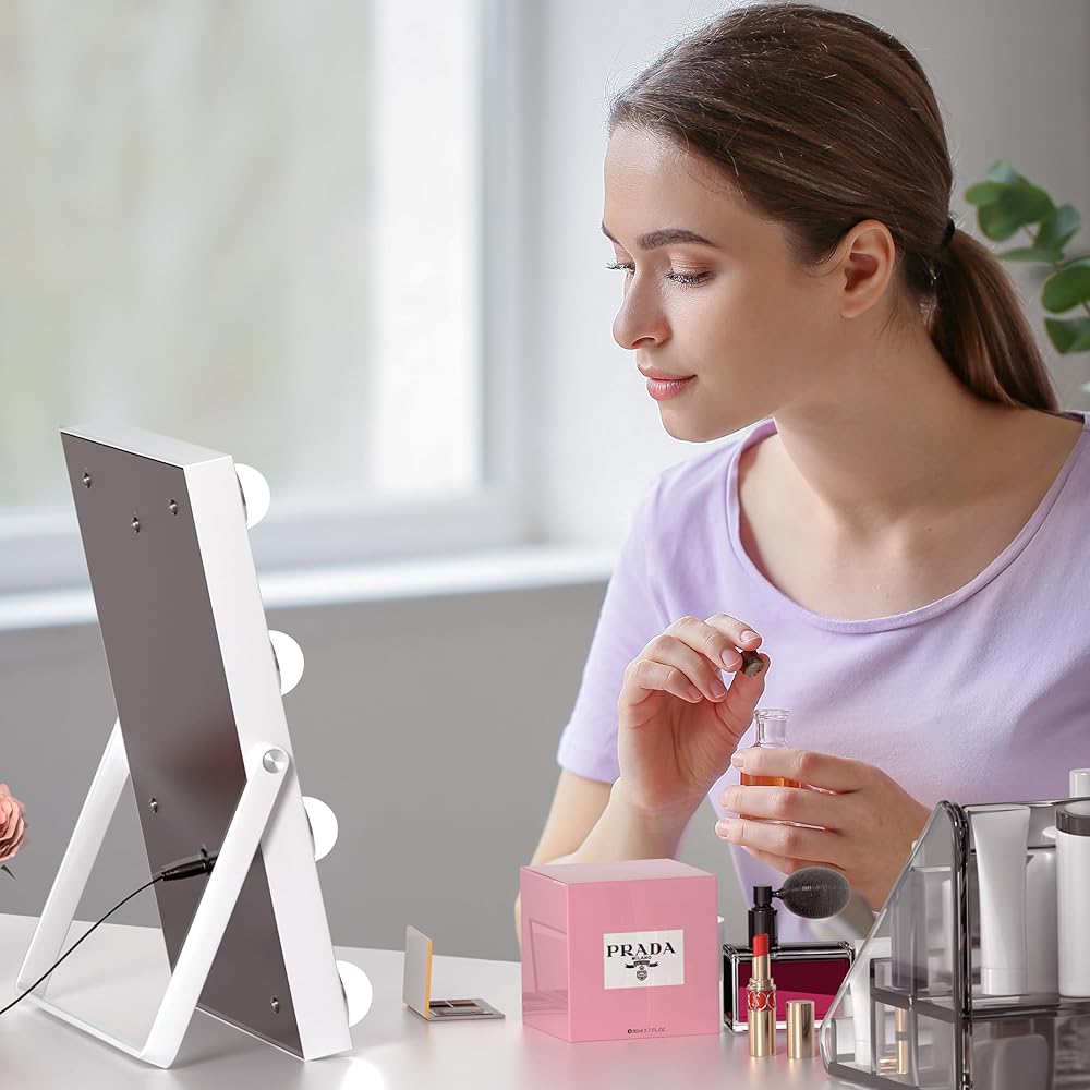 تأتي مرآة الزينة هوليوود هذه في إطار معدني ثابت وحامل يمكن تدويره بزاوية 360 درجة لدعم تعديلها إلى أي زاوية معينة مع أفضل رؤية لك.