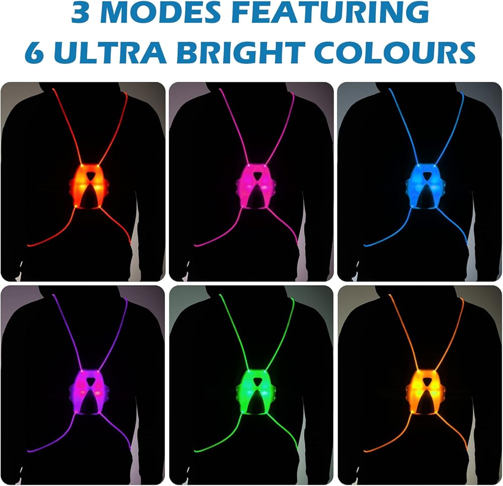 🏃 【أضواء عالية الوضوح ومتعددة الألوان 】تم تجهيز السترة العاكسة LED بمصابيح LED متعددة الألوان فائقة السطوع. إضاءة 360 درجة و3 خيارات أوضاع إضاءة يصعب تفويتها. الوضع 1، تغيير بطيء بين 6 ألوان صلبة فائقة السطوع - أحمر وردي أزرق أرجواني أخضر برتقالي؛ الوضع 2، أي من الألوان الستة المذكورة أعلاه، الوضع 3، يتغير بسرعة بين الأضواء متعددة الألوان.