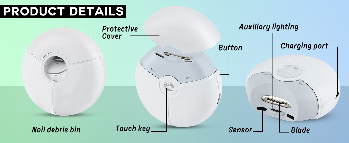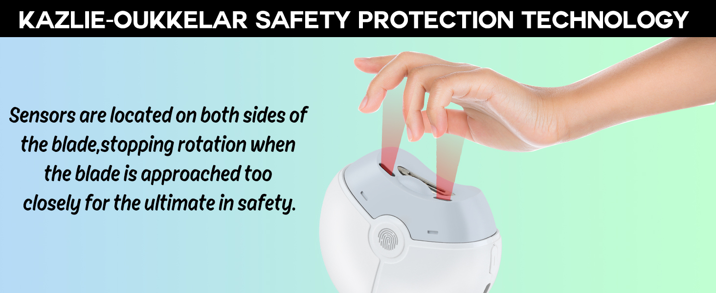 تصميم وقائي - توجد أجهزة استشعار على جانبي ماكينة قص الأظافر الكهربائية، وعندما يقترب كف اليد بالكامل من ماكينة قص الأظافر الأوتوماتيكية، تقوم المستشعرات بإيقاف ماكينة الحلاقة من الدوران لضمان أقصى قدر من الأمان.