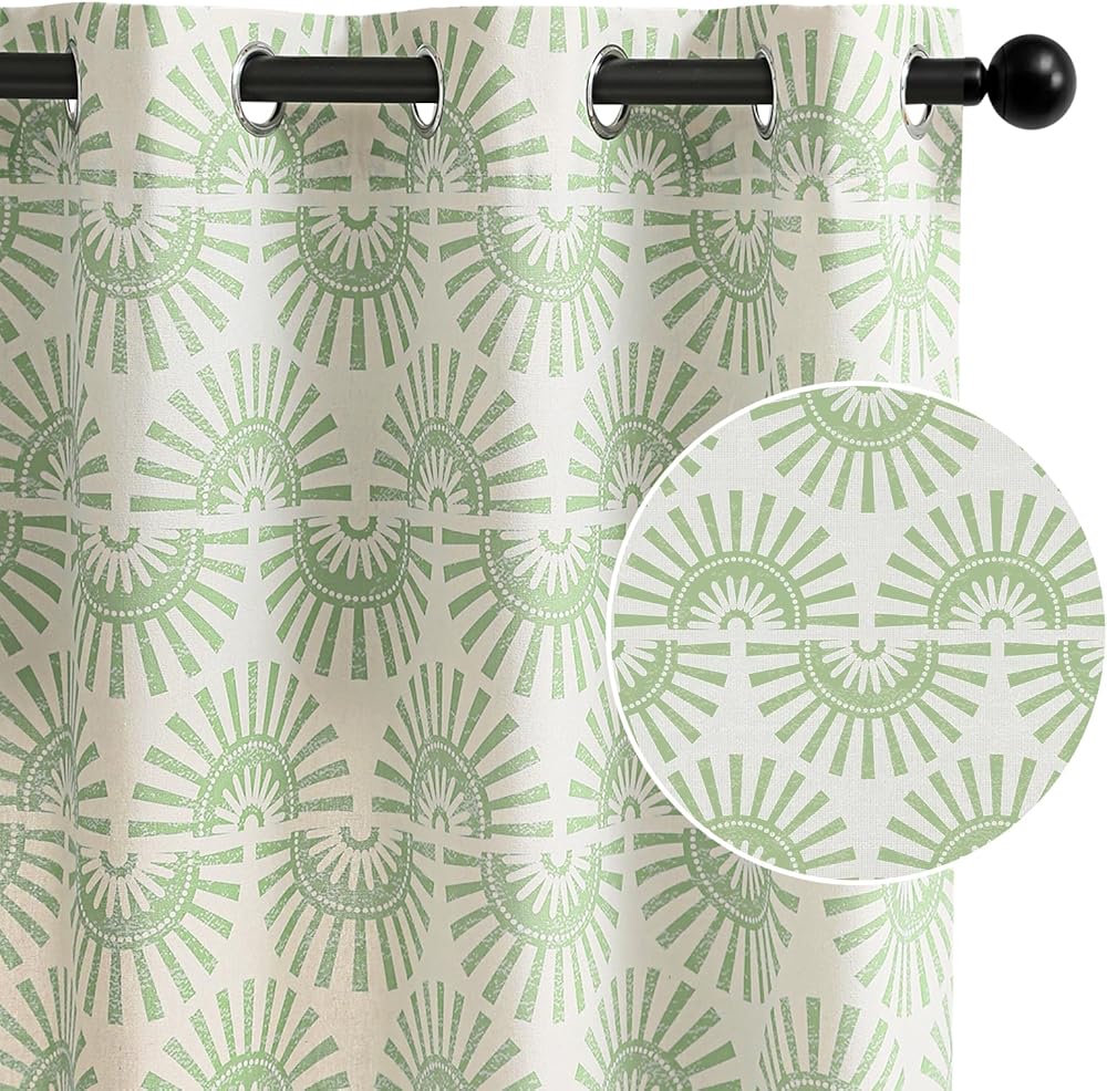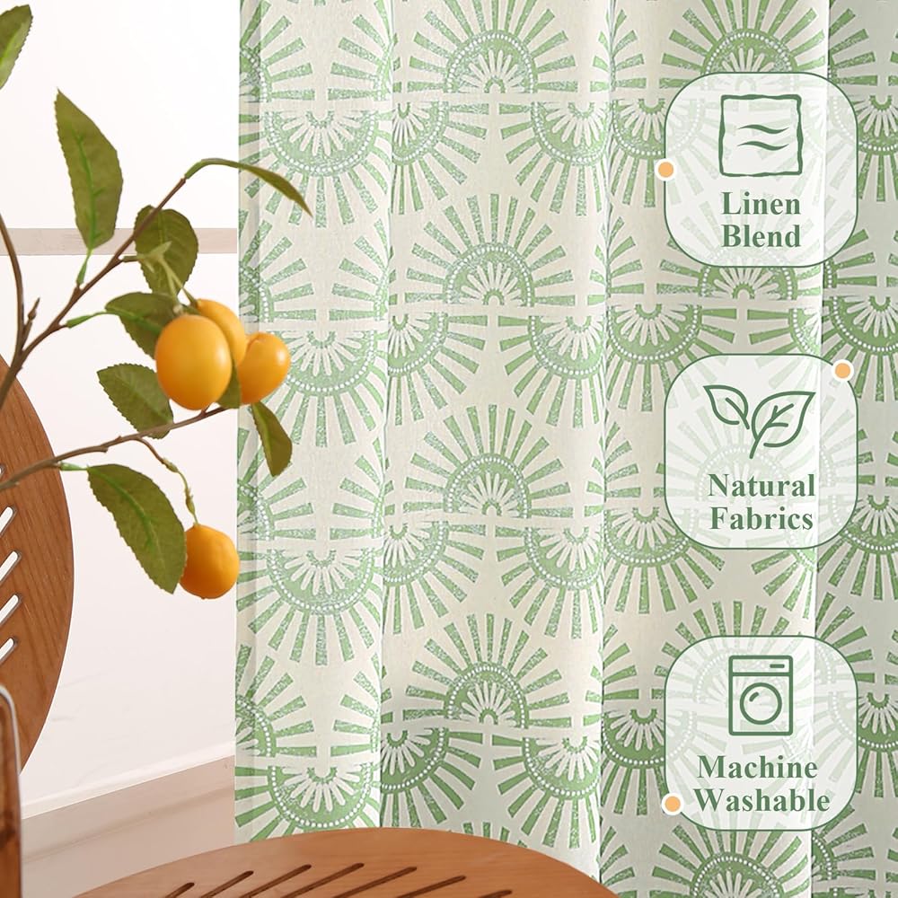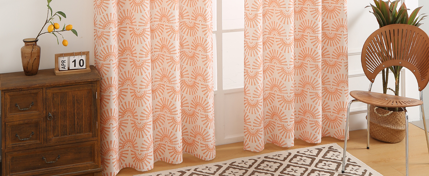 ستائر بوهو: ستائر شبه شفافة تتميز بتصميم بوهو. تتم طباعة نسيج مزيج الكتان الطبيعي بنمط شروق الشمس، مما يضفي لمسة نابضة بالحياة على حياتك اليومية. وفي الوقت نفسه، تمنحنا طباعتها على شكل قطع خشبية الشعور المصنوع يدويًا الذي نحبه