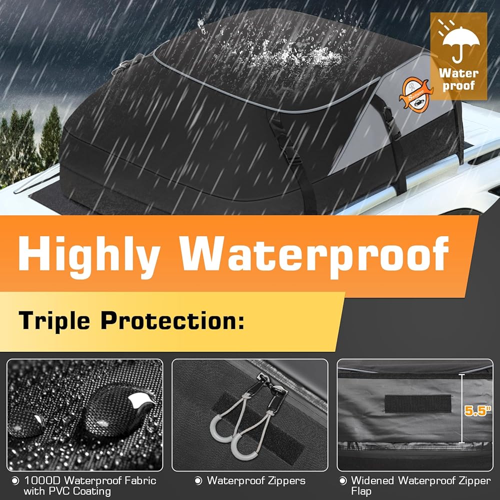 • 【مقاومة للماء ومتينة】حقيبة سقف السيارة الخاصة بنا مصنوعة من مادة PVC المقاومة للماء 1000D، ومصممة بسحابات طلاء مقاومة للماء وأشرطة متينة لمنع اختراق الماء، سواء كانت الرياح أو الشمس أو المطر أو الثلج أو الرمل، ويمكنها أيضًا توفير طقس مثالي. حماية.