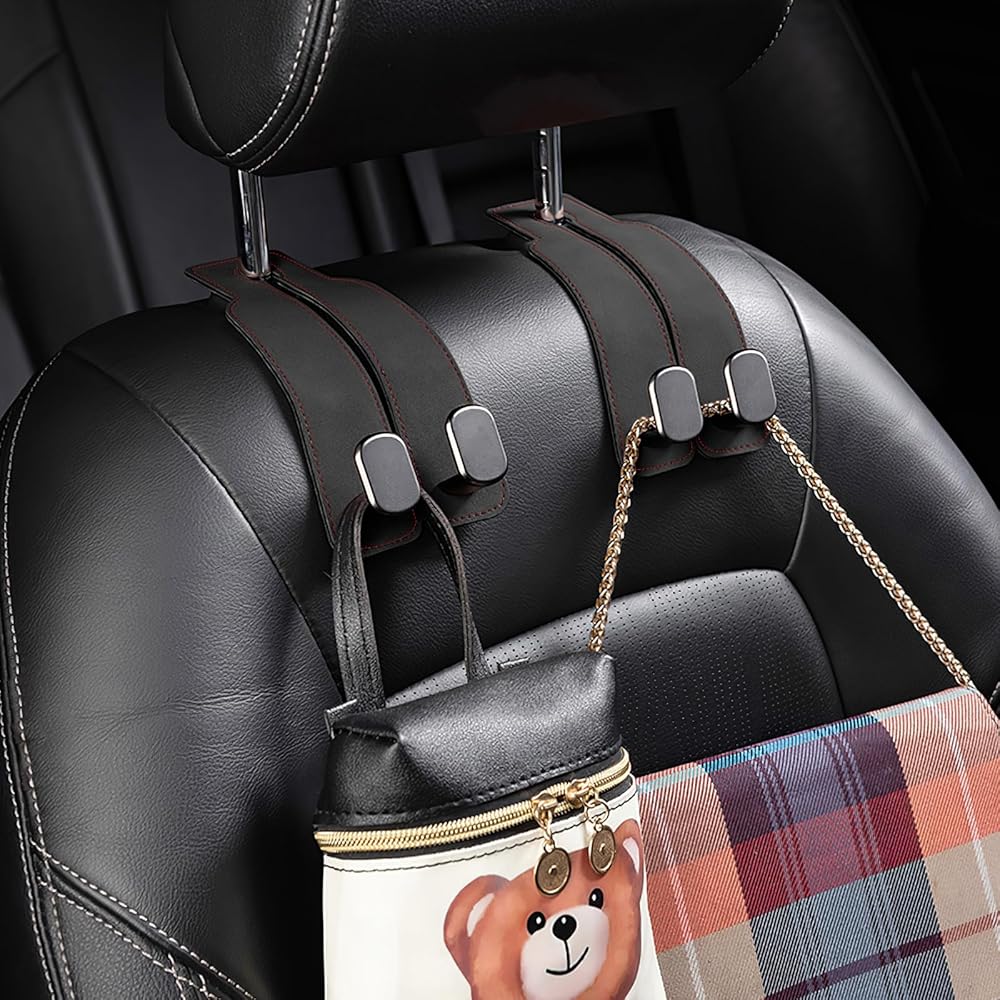 🚗[Premium Materials] - Crafted from high-quality leather and metal, these car headrest hooks ensure resilience without the risk of breakage, combining durability with a stylish appearance.