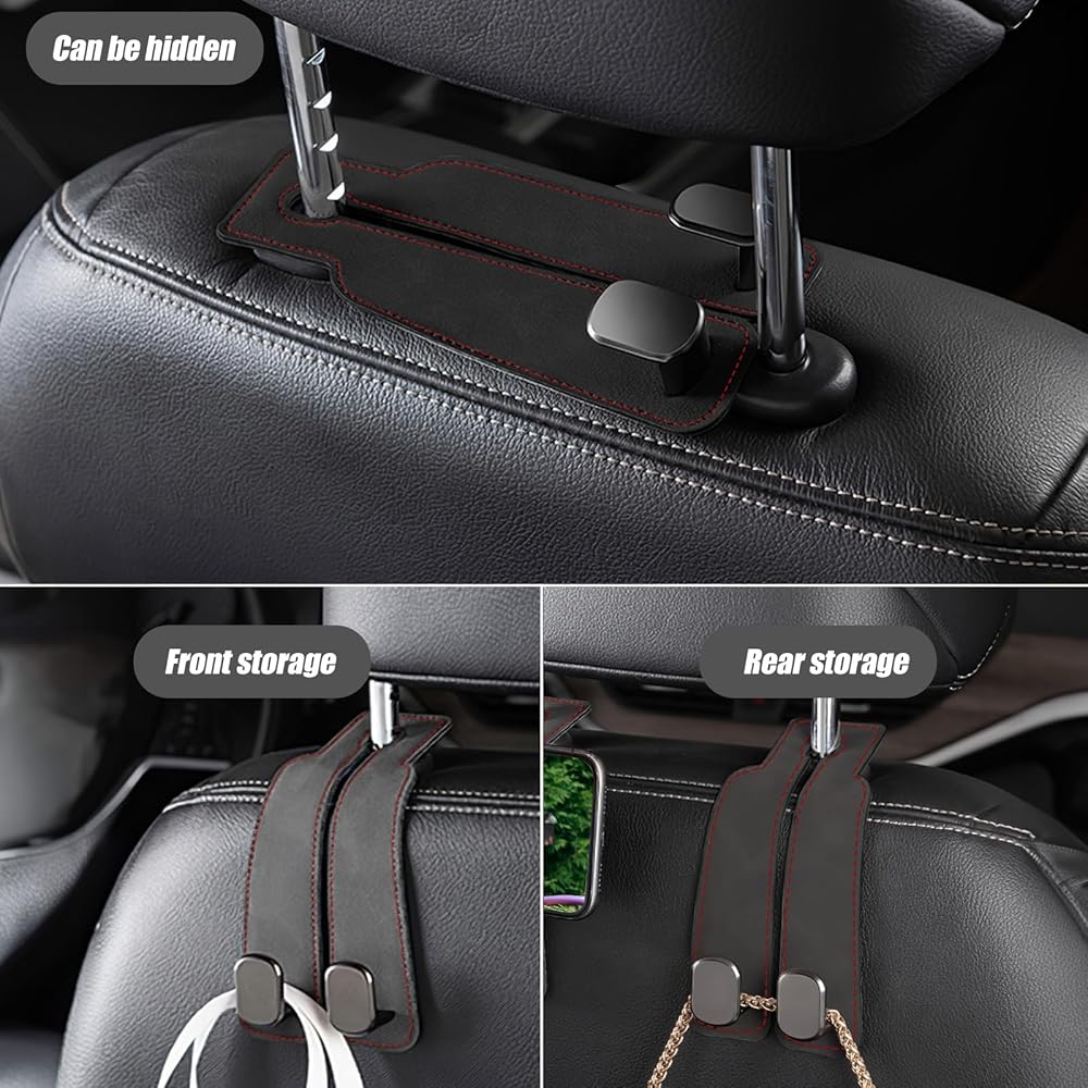 S SUNSBELL قطعتان من الخطافات المزدوجة لمقعد السيارة الخلفي، من جلد الغزال مع خطافات مزدوجة لمسند رأس مقعد السيارة المعدني، وحامل الهاتف المحمول، ومنظم ظهر مقعد السيارة، وخطاطيف دعم مسند رأس السيارة للمحافظ والحقائب