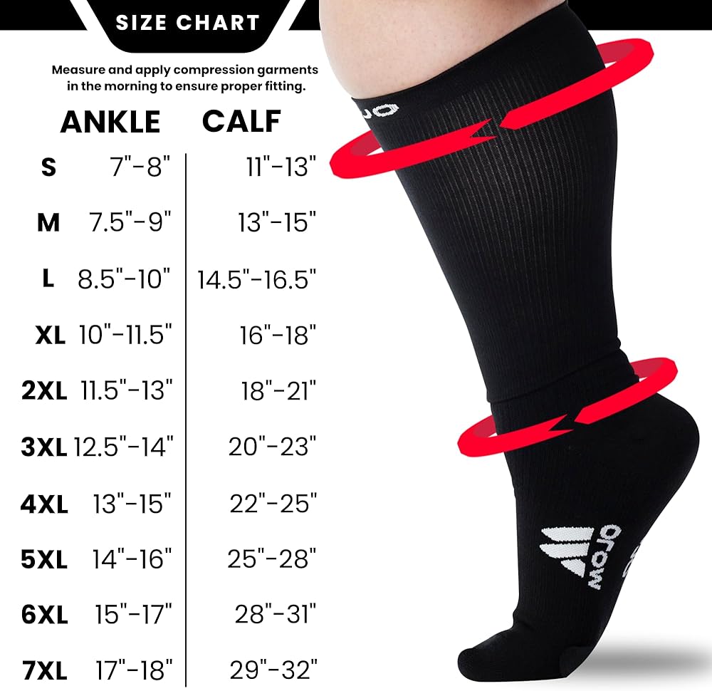 مقاس شامل للرجال والنساء: نقدم الطعام لكل من الرجال والنساء ذوي الأقدام ذات الحجم الكبير، جوارب الضغط السوداء لدينا متوفرة بمقاسات 2XL-5XL، مما يوفر ملاءمة مريحة وآمنة لمختلف أنواع الجسم.