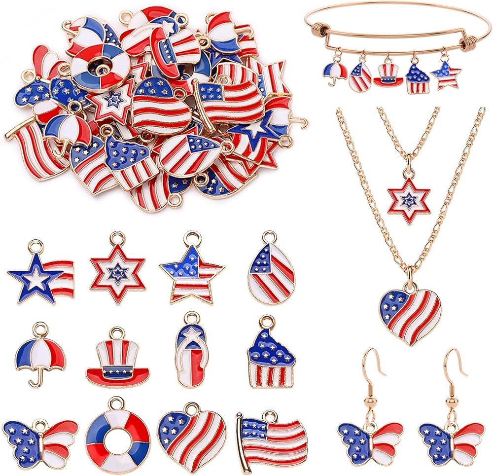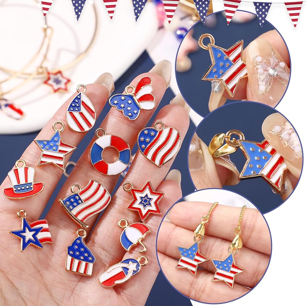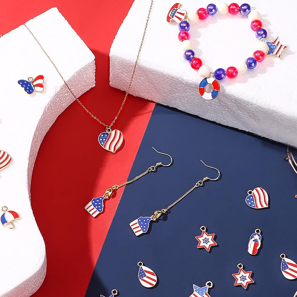🎈🎈【سحر متعدد الاستخدامات】-- اصنع إكسسوارات ممتعة ومرحة باستخدام هذا السحر الرائع والرائع على شكل العلم الأمريكي. رائعة لصنع المجوهرات مثل القلادة والأقراط والأساور وما إلى ذلك بالإضافة إلى سلسلة مفاتيح حقيبة اليد والسحر وتزيين الهدايا وغير ذلك الكثير. أضف لمسة من الألوان إلى إكسسواراتك!
