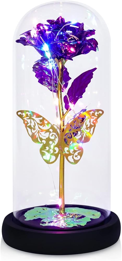 • تصميم إبداعي فريد من نوعه: زهور زجاجية كريستالية تتفتح من قاعدة سوداء صلبة، مع فراشة تتراقص تحت الوردة التي لا تذبل أبدًا. تم دمج ضوء LED المدمج في البتلات، وبمجرد تشغيل المفتاح السفلي، تضيء الأضواء الملونة الغطاء الزجاجي بالكامل، مما يخلق أجواء رومانسية وساحرة. يمكن رؤية ألوان مختلفة من الورود الصناعية تحت أضواء وزوايا مختلفة مما يزيد من الأجواء الرومانسية.