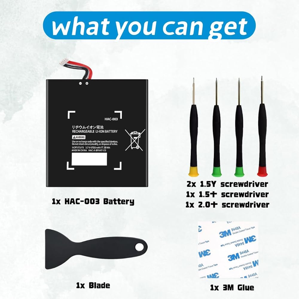 【متى تكون هناك حاجة إلى هذه البطارية؟ 】عندما تواجه بطارية وحدة التحكم في الألعاب الخاصة بك مشاكل مثل استهلاك الطاقة السريع، والإغلاق المتكرر والشحن المتكرر، قد تفكر في استبدال بطارية وحدة التحكم في الألعاب للحصول على تجربة لعب أفضل. ملاحظة: الحزمة تتضمن 1 * بطارية بديلة HAC-003، تتضمن العبوة 2 × 1.5*3.0 مم مفك براغي، 1 × 1.5*3.0 مم + مفك براغي، 1 × 2.0*3.0 مم + مفك براغي، 1 × عتلة للبطارية الأصلية، 1 × شريط لاصق لتثبيت البطارية.