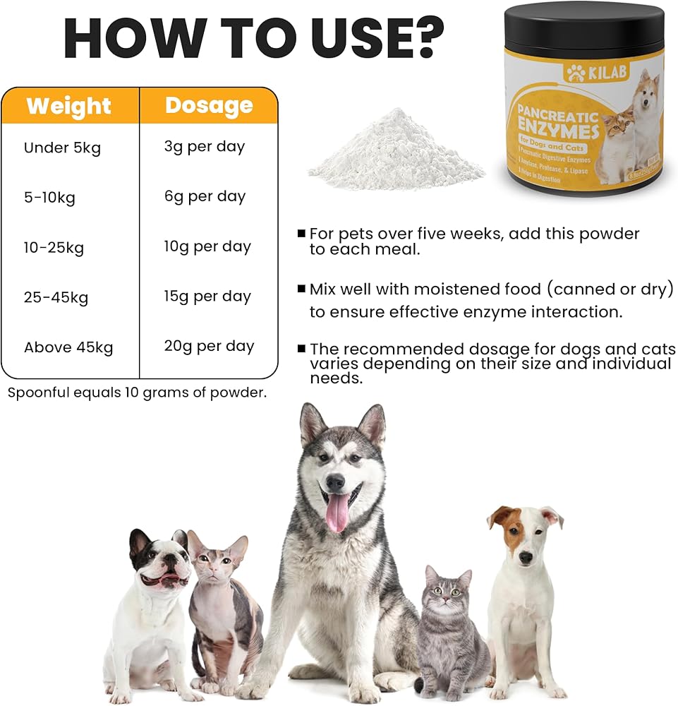 تركيبة إنزيمية شاملة: تحتوي على مزيج من الإنزيمات الأساسية بما في ذلك الأميليز والبروتياز والليباز للمساعدة في هضم الكربوهيدرات والبروتينات والدهون، مما يعزز امتصاص العناصر الغذائية بشكل أفضل لصحة كلبك بشكل عام.