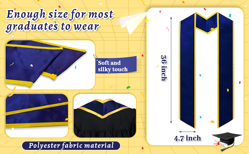 • خامة عالية الجودة - وشاح التخرج للجنسين مصنوع من نسيج الساتان اللامع من البوليستر بنسبة 100%، مما يجعله أكثر رقة وأكثر ملمسًا وناعمًا ومريحًا في الارتداء. ليس من السهل أن تبهت، أو تتجعد أو تنكسر، ويمكن أن توفر لك خدمة طويلة الأمد.