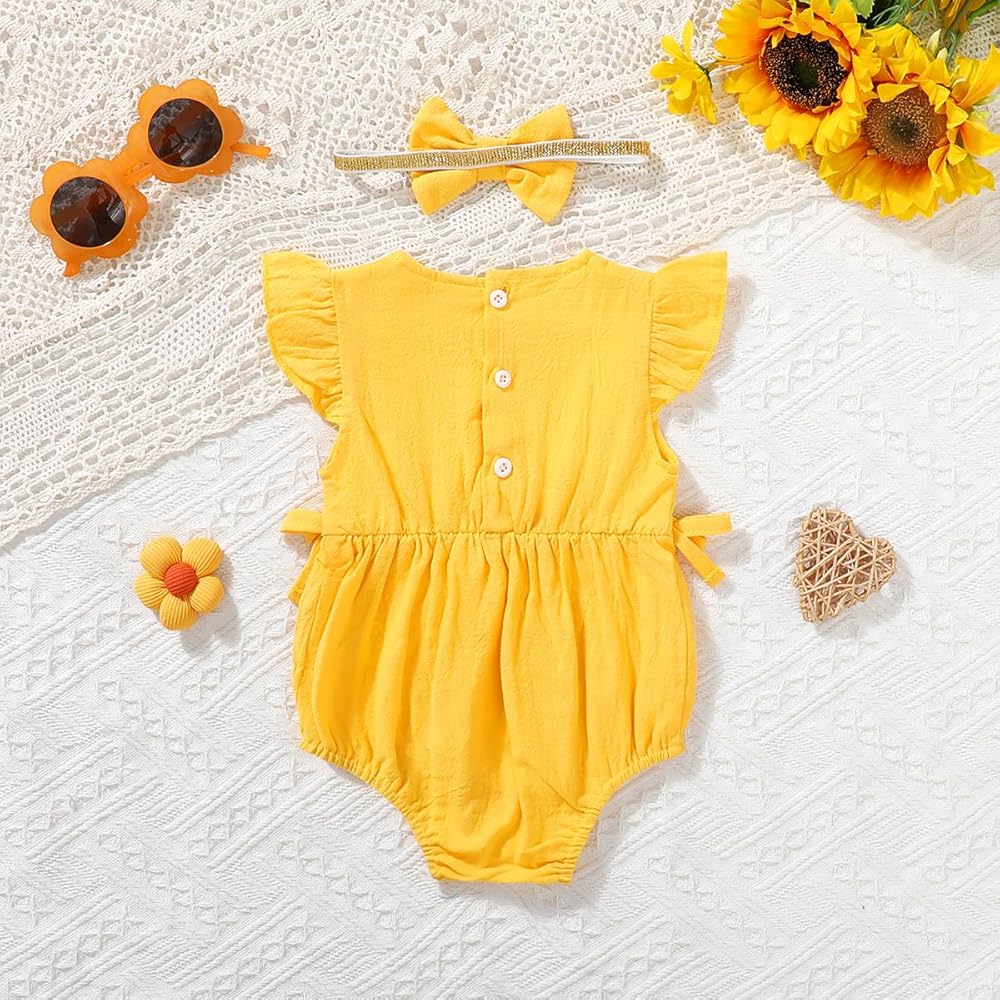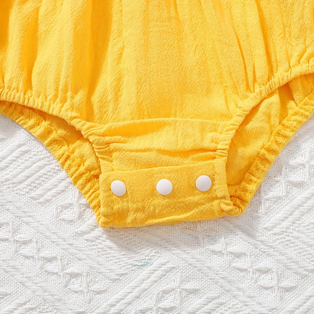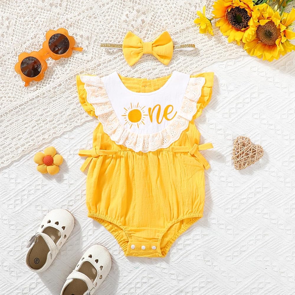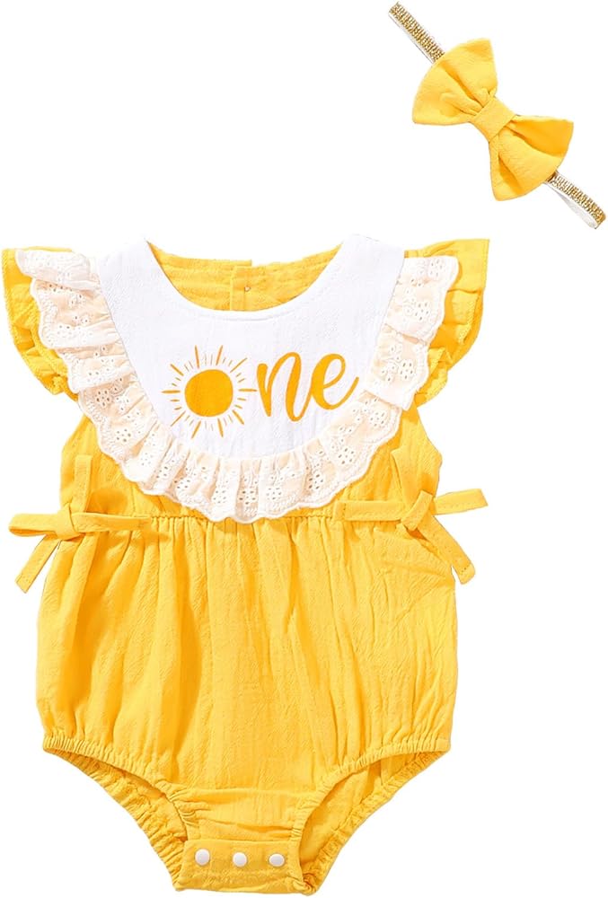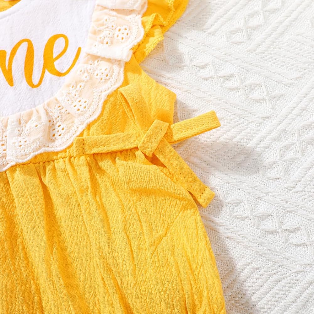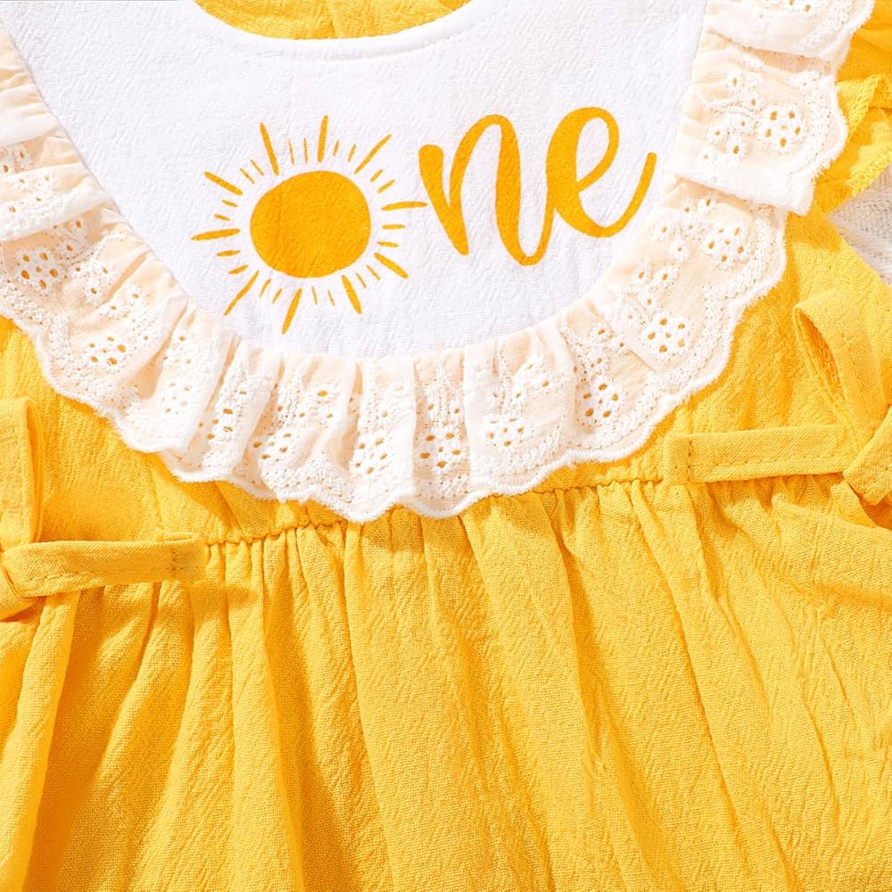 - دانتيل أصفر وأبيض مع تصميم على شكل فيونكة، مما يسمح لطفلك بالحصول على عيد ميلاد أول رائع. سيحب طفلك زي عيد الميلاد الأول هذا