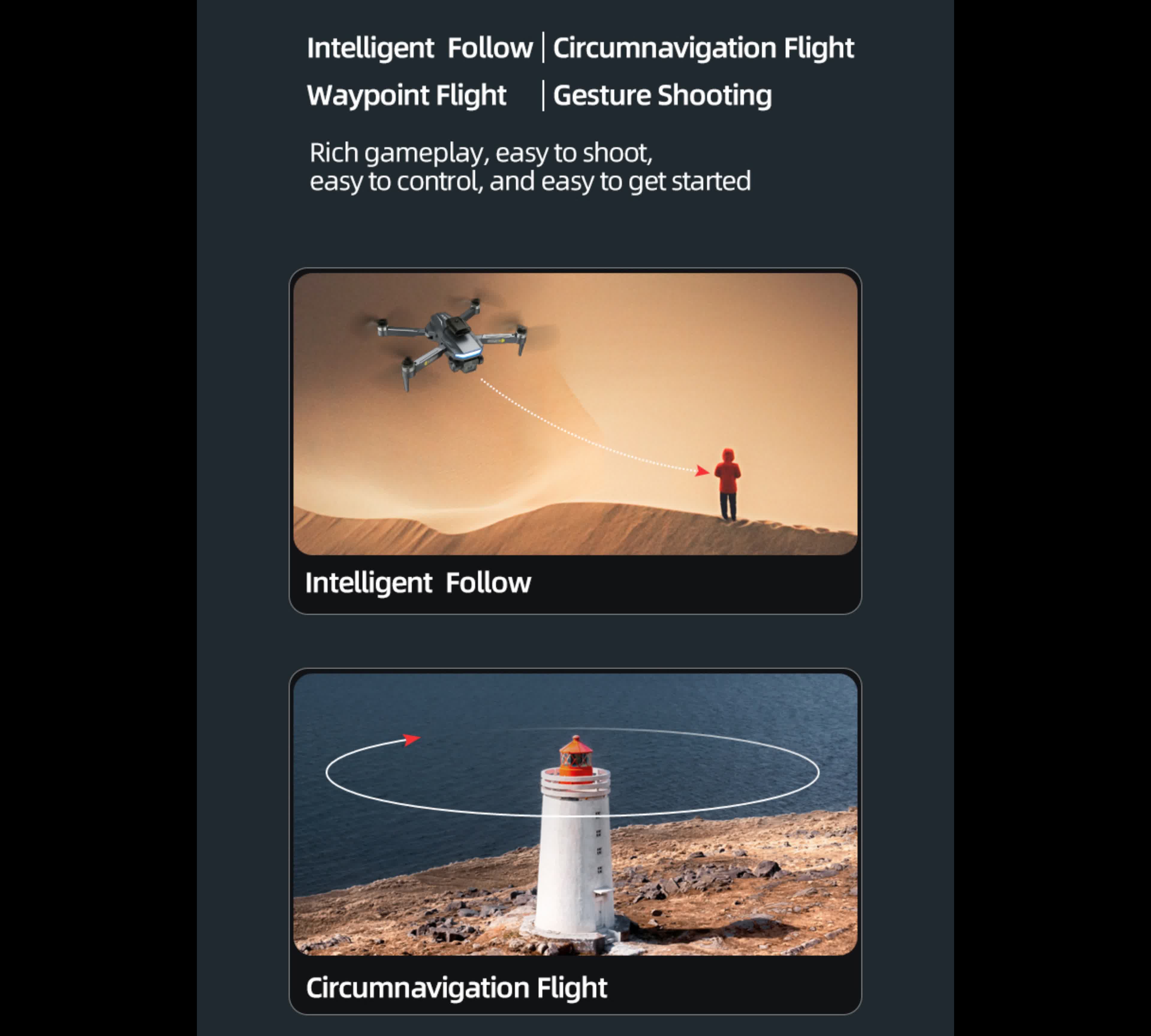 تتميز المركبات الجوية والكاميرات بدون طيار بأنها حساسة وقابلة للتكرار بدرجة عالية وحساسة بذكاء وتوفر إخراج صور عالية الوضوح ومليئة بالبهجة والمكافأة من الصباح حتى الليل؛ دعم التصوير من زوايا مختلفة: عمودي، أفقي، وعلوي. توفر لك أنظمة الكاميرا الثلاثة النادرة المتوفرة في السوق مساحة إبداعية أكبر