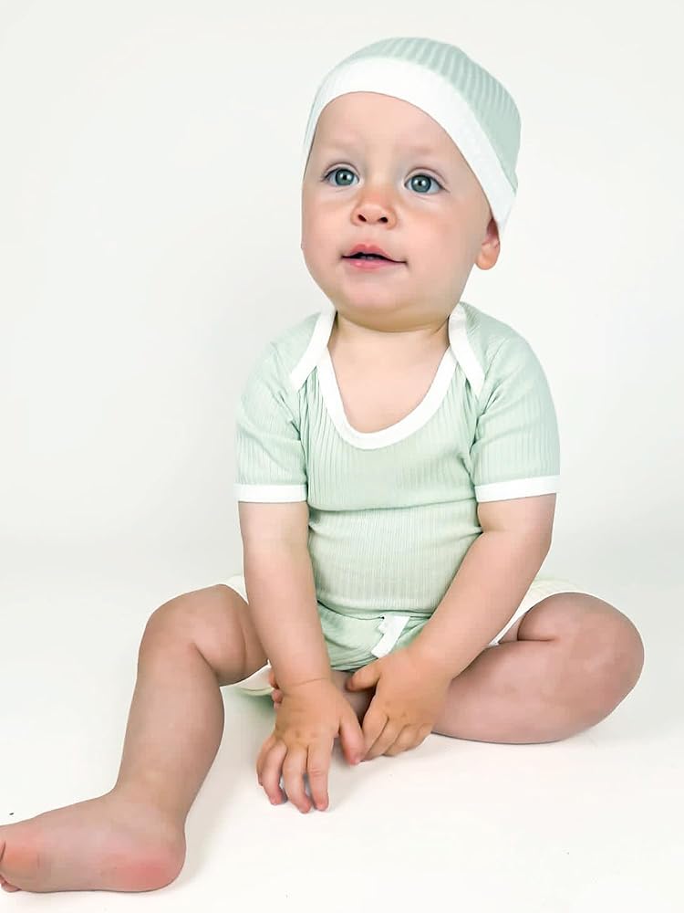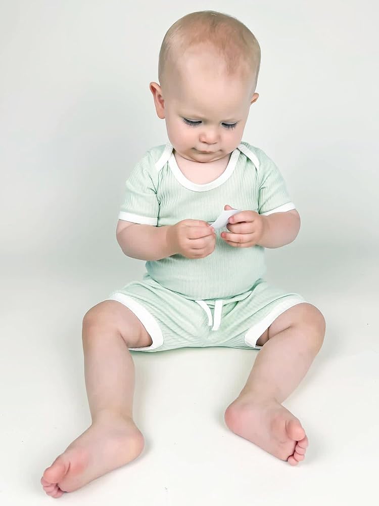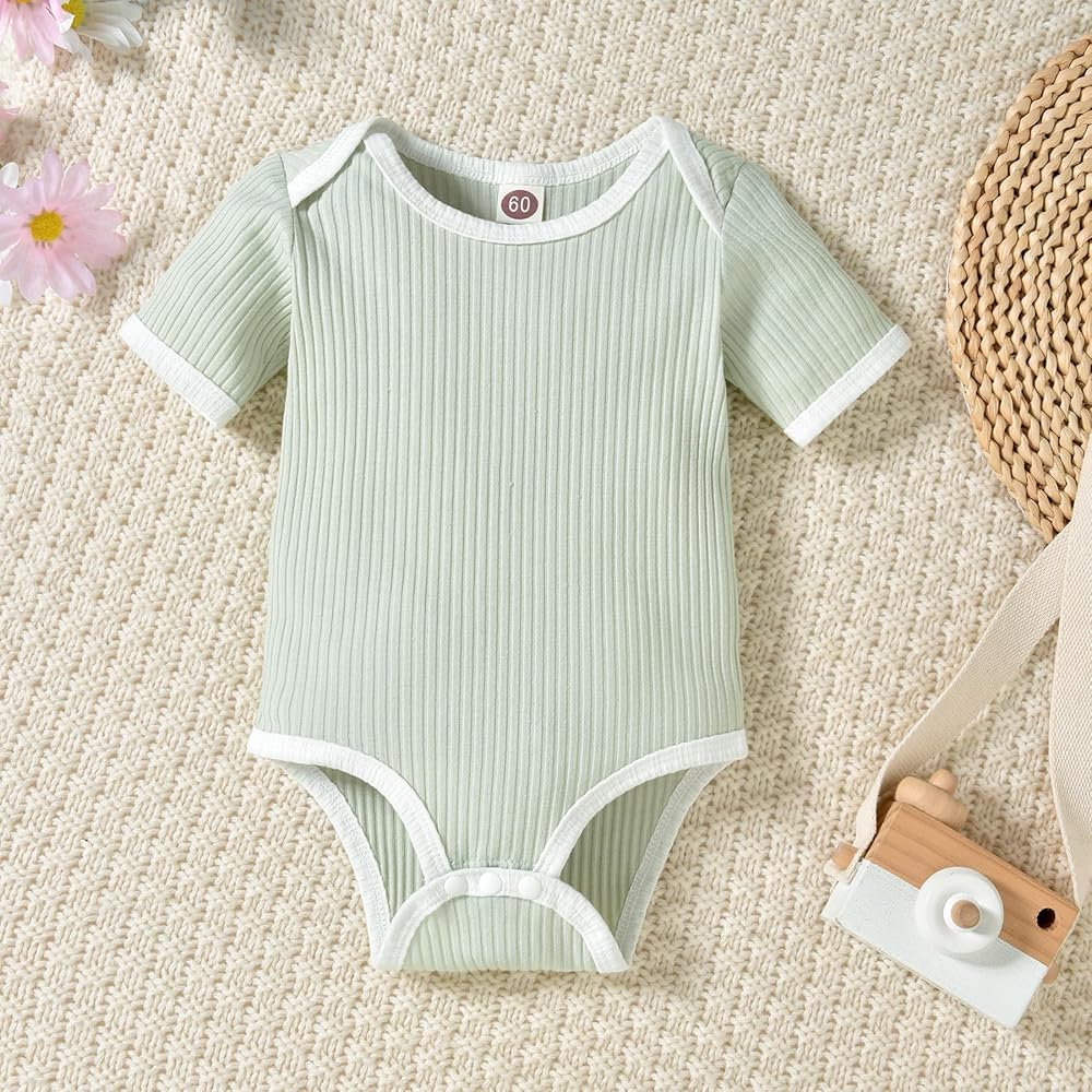 √ تصميم كلاسيكي: ملابس صيفية لطيفة للجنسين من الأولاد والبنات، بدلة قطعة واحدة مضلعة برقبة دائرية بلون سادة وأكمام قصيرة، شورت بحزام خصر مرن، قبعة وعصابة رأس متطابقة لمجموعة ملابس كاملة للجنسين، اختيار جيد لملابس اللعب والملابس المنزلية.