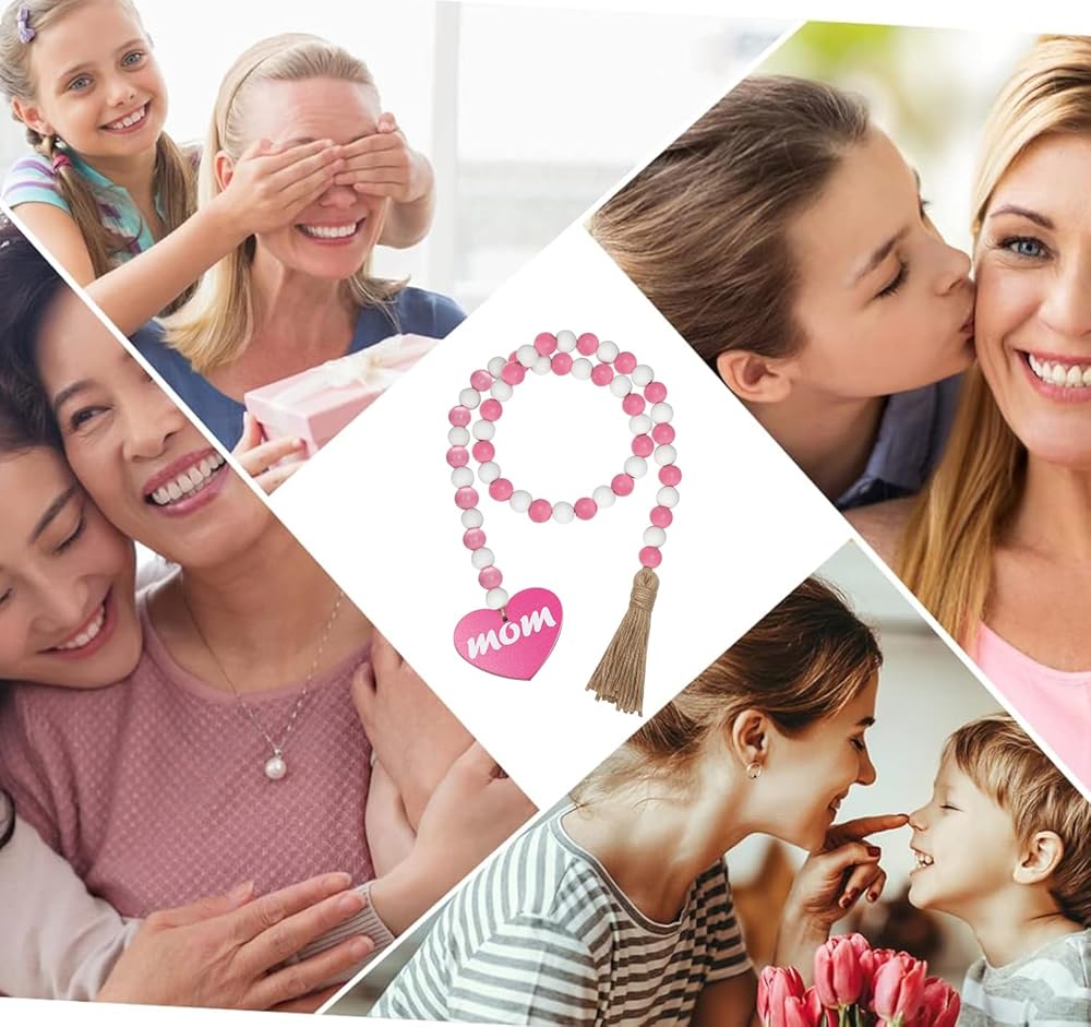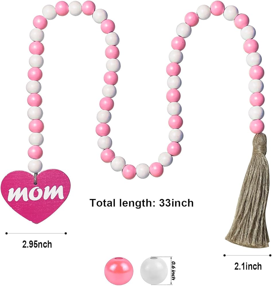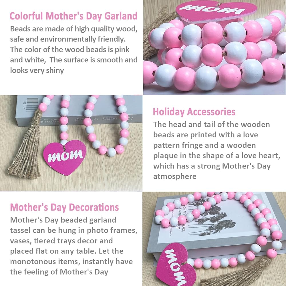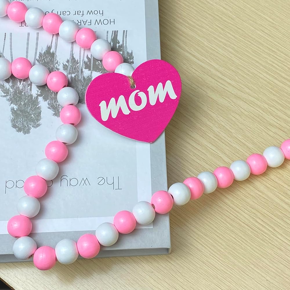 【Unique Design】Our natural Mother's Day wood bead garland comes with rustic tassels and wooden heart-shaped pendants, pink and white wood beads, MOM wood decoration, which is in line with the atmosphere of sweet decor. Also a nice gift for your mom.
