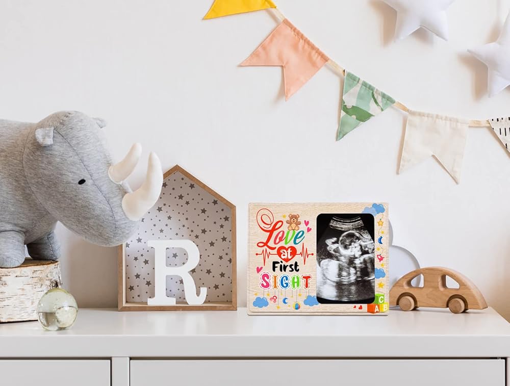 BABY SONOGRAM PICTURE FRAME: Wood picture frame features baby elements design and words ''Love at first sight'', looks cute and funny, great baby sonogram ultrasound picture frame for gender-neutral nursery decor baby girl nursery decor baby boy nursery decor