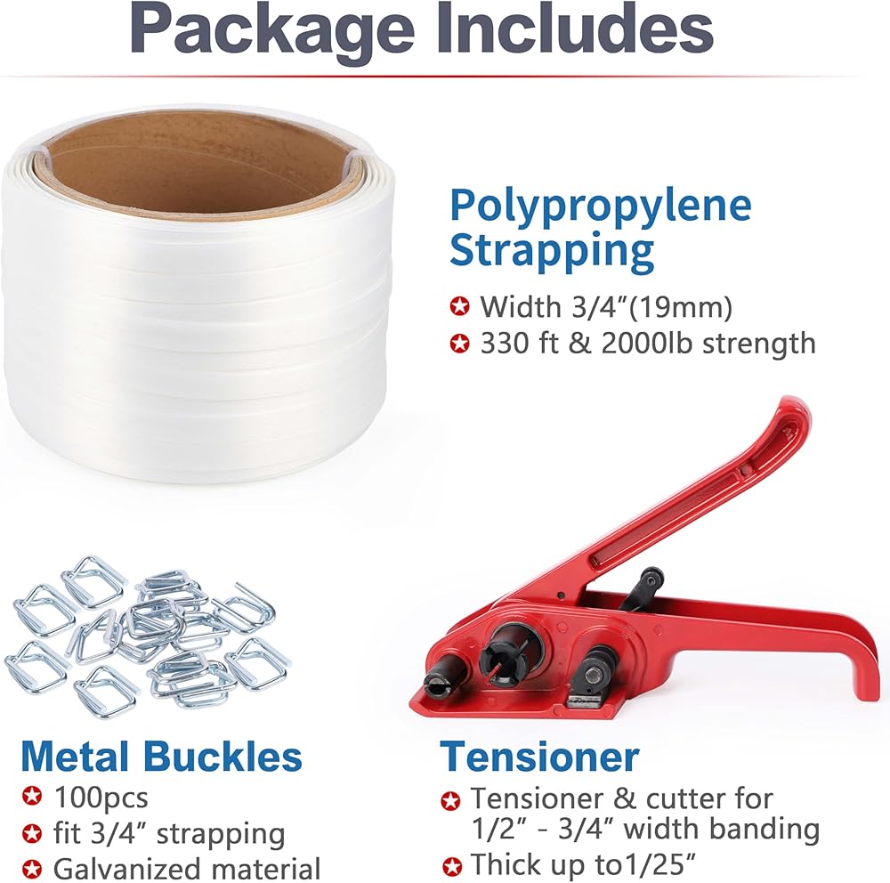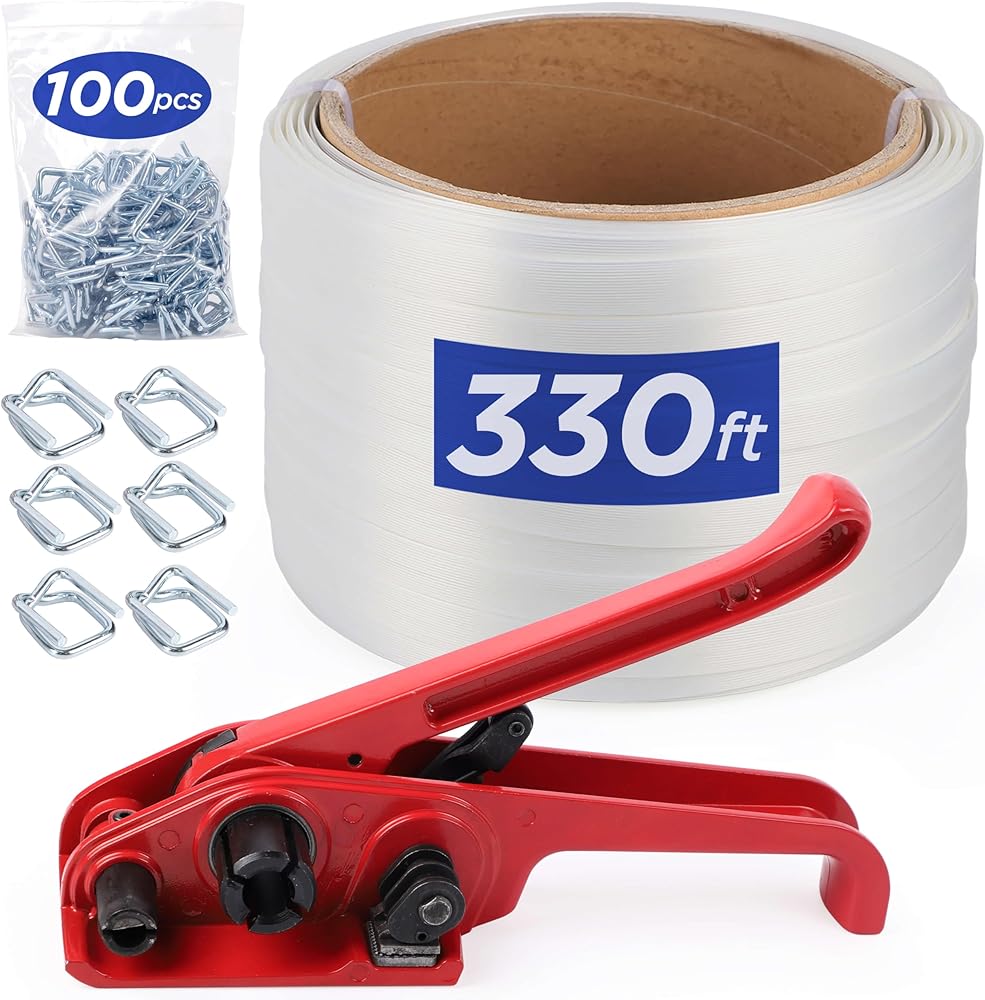 مجموعة أشرطة التغليف Hawaminent - 3/4 بوصة × 330 قدم من البوليستر المنسوج من مادة البولي بروبيلين، أداة شد الربط، 100 قطعة من الأبازيم الفولاذية، قوة الشد، عبوة مرنة قابلة لإعادة الاستخدام