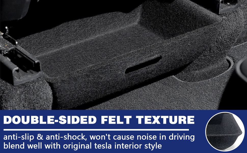 [نسيج لباد مزدوج الجوانب]: حجرة التخزين مصنوعة من مادة أكريلونتريل بوتادين ستايرين الممتازة، قوية ومتينة مع سعة وزن ممتازة. وهي مغلفة بلباد سميك على الجانبين. السطح المتدفق يمكّنه من مقاومة الانزلاق والاهتزاز والضوضاء، ويمتزج جيدًا مع طراز تيسلا الأصلي.