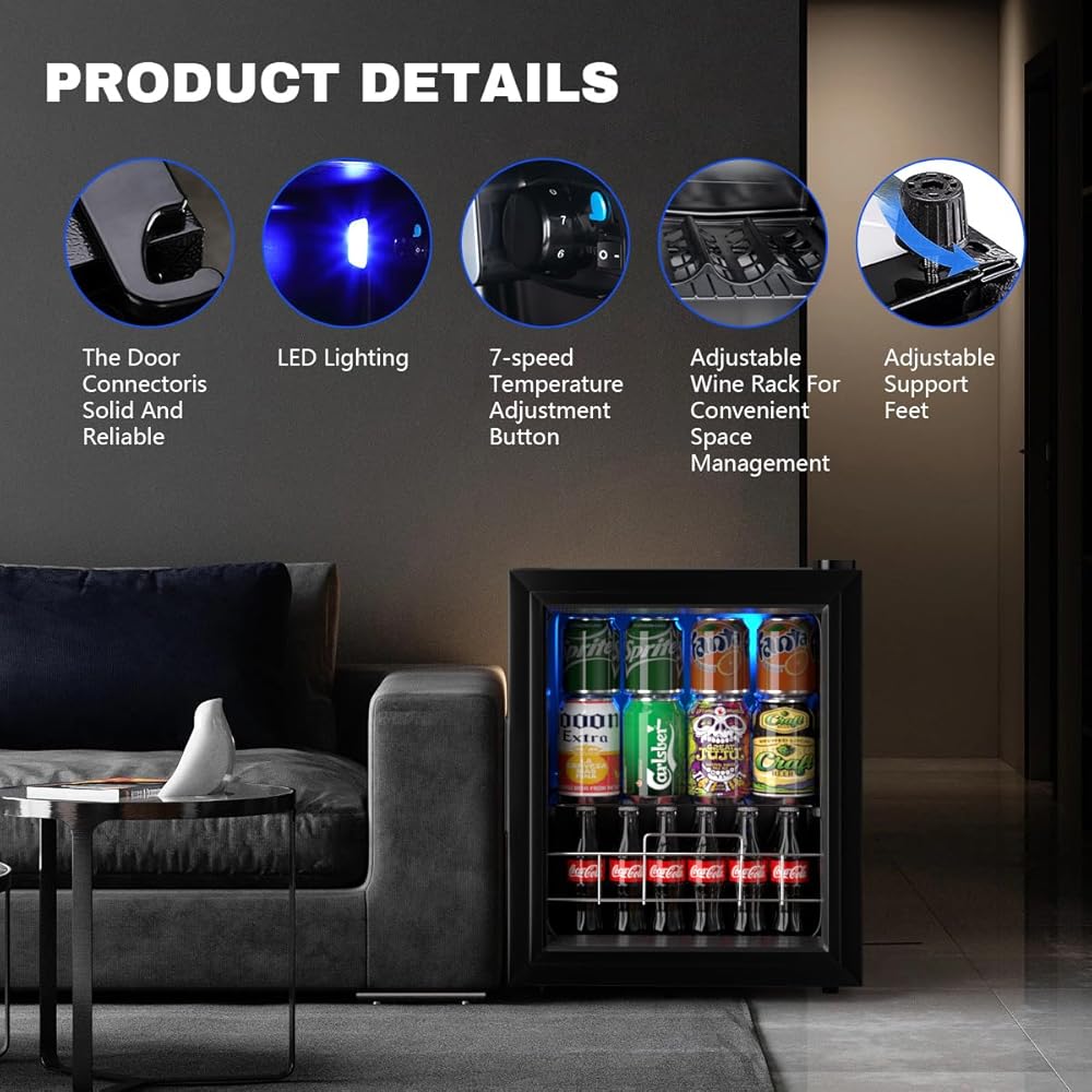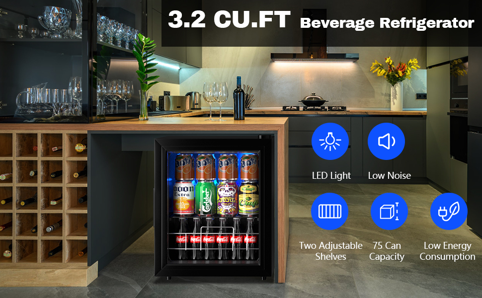 EUASOO 75 علبة مشروبات، ثلاجة تبريد النبيذ، ثلاجة صغيرة صغيرة قائمة بذاتها، مبرد مشروبات مع باب زجاجي رفوف قابل للتعديل لصودا البيرة أو النبيذ، مكتب مثالي للمنزل أو البار باللون الأسود